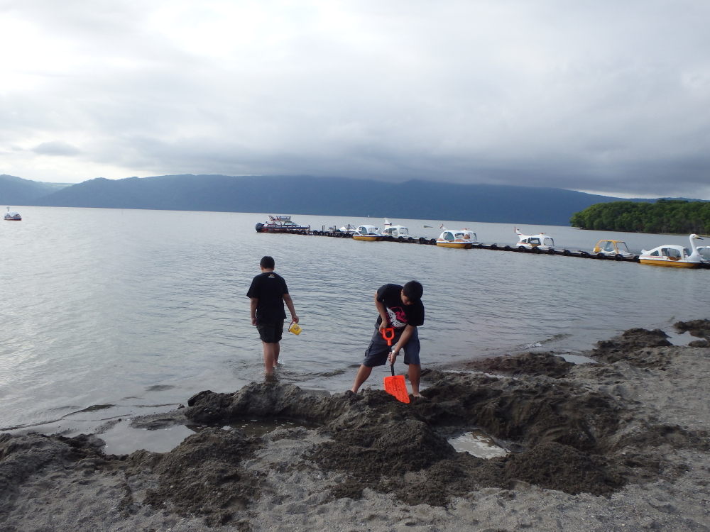 | 時間なりボート乗り場に引き返す。今度は湖畔で、温泉を掘る。足で温かい温泉を掘り当てて満足する。 |