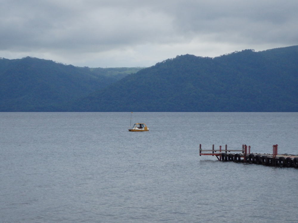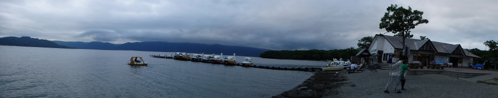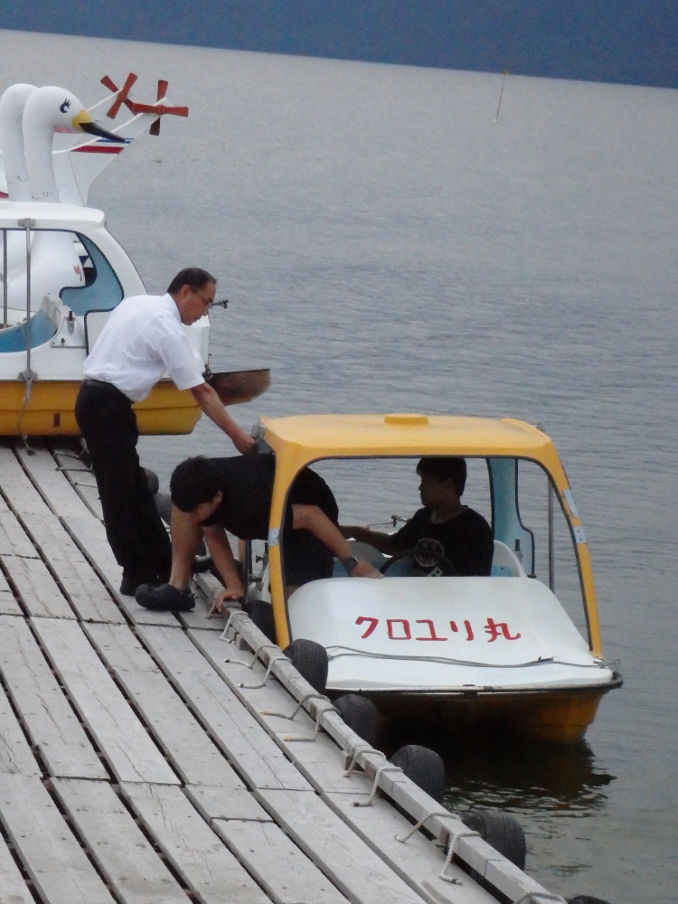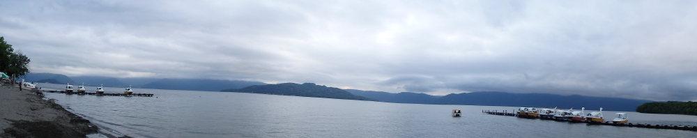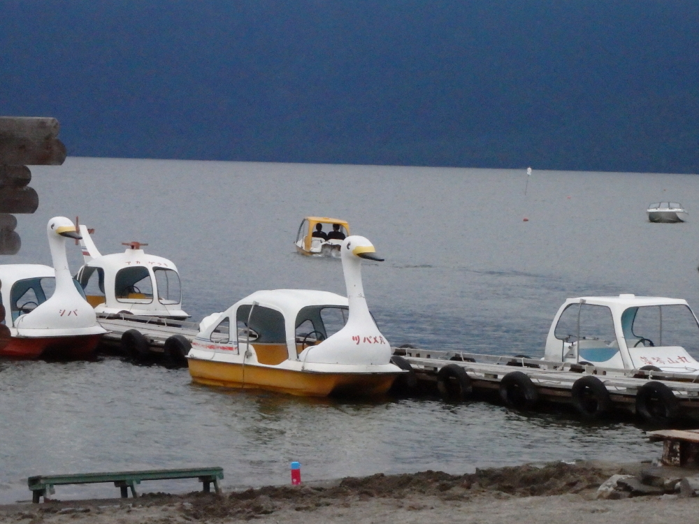 | あいにくの曇り空だったので、湖を囲む山々は見えなかった。ボートに乗ろうと乗り場に近づくと看板があった。ボート乗り場からスワンボートに乗り沖を目指す。 |