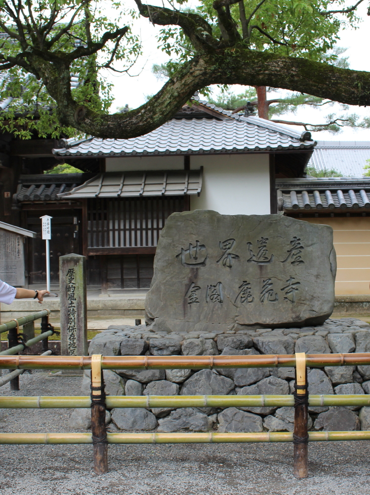 | 総門前に「歴史的風土特別保存地区」と「世界遺産/金閣鹿苑寺」の石碑が鎮座している。中に入って行くと、池に映えた金閣寺が目に飛び込んでくる。金閣寺手前の池は鏡湖池(キョウコチ約6,600㎡)で、池に浮かぶ二本松のしまは葦原島(アシハラジマ)というゆだ。池の周りを辿って金閣寺に近づいて行くと、池は奇岩や名石で囲まれているようだ。金閣舎利殿の看板を見ると佛舎利(遺骨)を祀っているようだ。 |