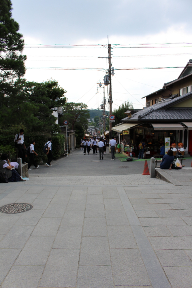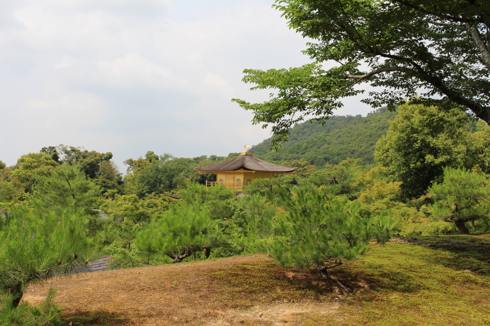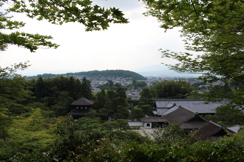 | 左側通行の階段を上りきると、崩れかかった石組ある「漱蘚亭跡(Sosenteiato)」という所になる。展望所からは境内が一望され、その後ろに吉田山が見られた。その後ろにも大文字山らしい山影がある。展望所を下って行くと金閣寺の裏手に着く。 |