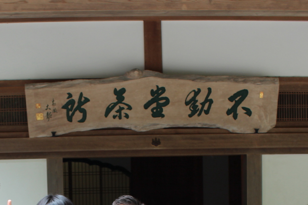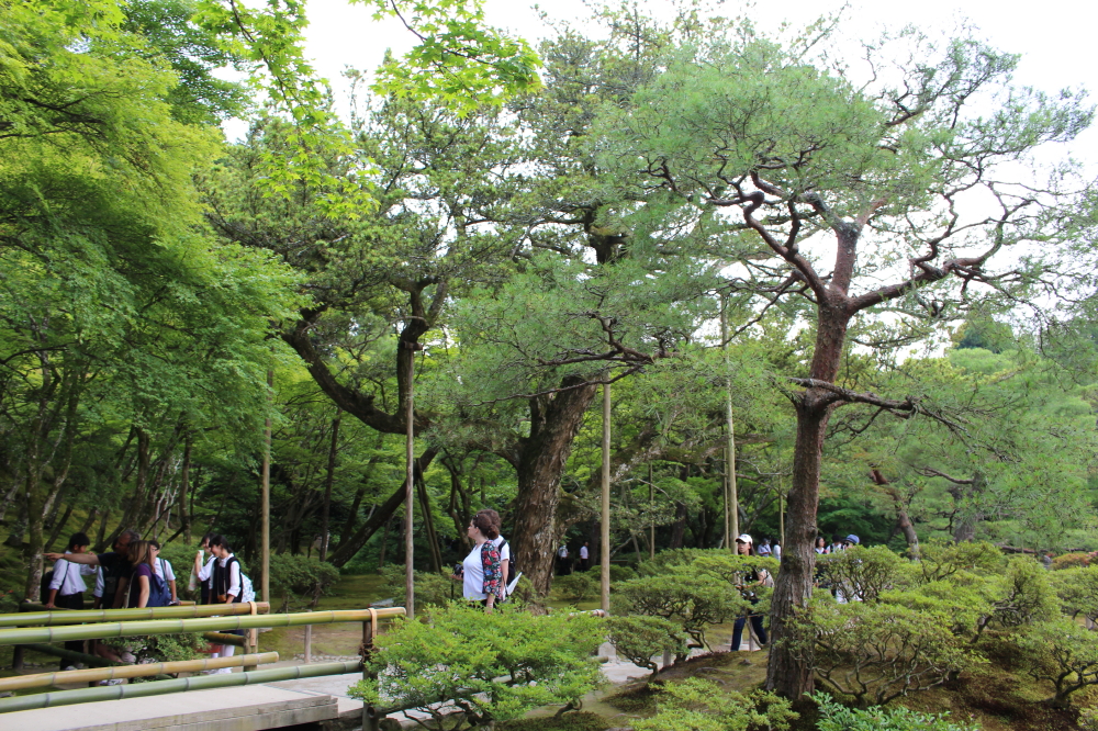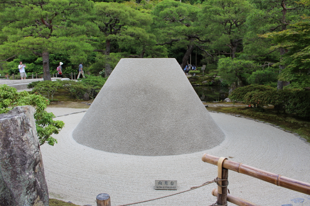 | 銀閣寺の前には白砂が敷かれた銀沙灘は帯状に規則正しく定規のメモリのように見える。その中に楕円錐の向月台が配置されていた。銀沙灘を見ながら東求堂に向かう。東求堂には額縁「東求堂」が飾られていた。展望所へと時計回りに林の中を辿って行く。途中でも銀閣寺が見えていた。 |