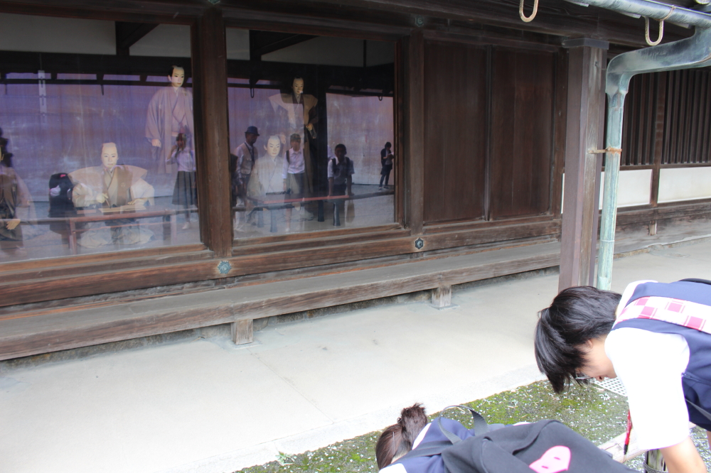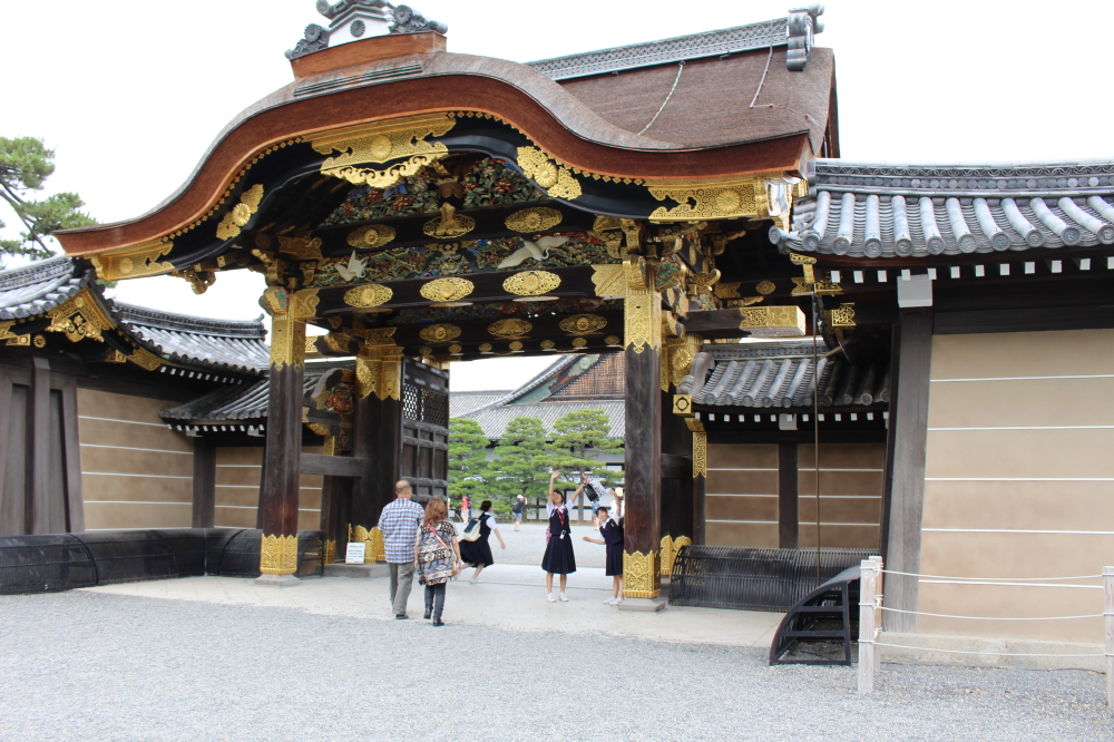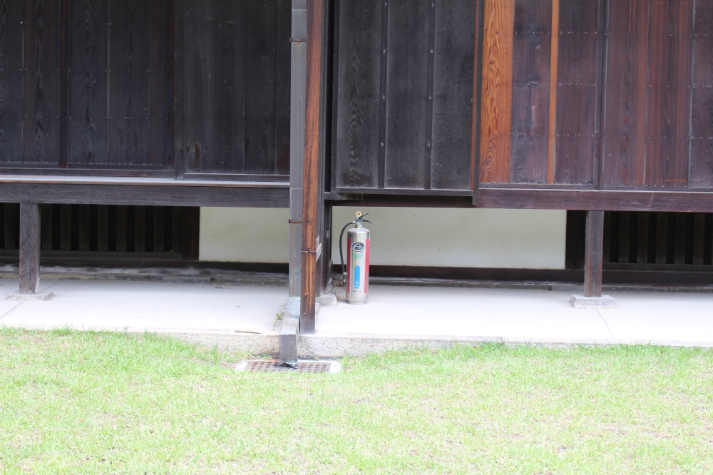| 東大手門を潜ると、入城券の券売機が並ぶ番所がある。その中にガラス越しだが人形が往時の姿を見せていた。城内には大手門よりも煌びやかな唐門がある。唐門を潜ると、離宮二条城が姿を現す。城内には消火栓が要所要所に備えられていた。 |