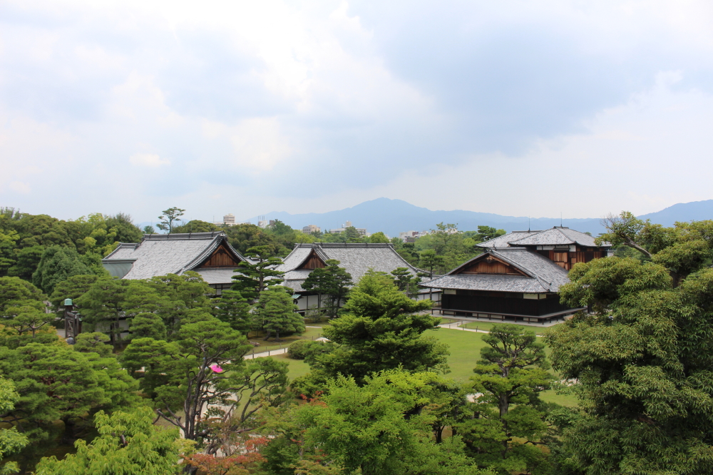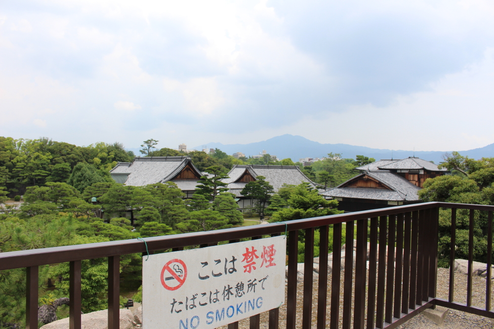 | 内堀に架かる橋の上の本丸櫓門を潜って、本丸に入ると本丸御殿がある。更に南西の端に天守閣跡がある。階段を登りきると天守閣跡になり、天守閣が建っていただけあって展望が良かった。遠くに比叡山と思われる山影が見えていた。本丸跡を後にして東大手門から出ると、石柱「史蹟 舊二條城離宮 二條城」「史蹟名称天然記念物/昭和十四年十一月文部大臣指定」「昭和十五年三月建設」があった。 |