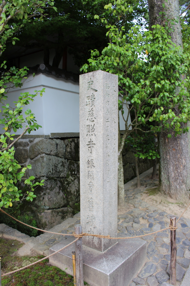 | 駐車場から法然院通を上がって行くと、銀閣寺の前に「まつばや」がありソフトクリームを食べる。銀閣寺の入口には境内の案内板や石柱「史蹟慈照寺(銀閣寺)舊境内」「史蹟名称天然記念物保存法二條/昭和六年二月月文部大臣指定」が鎮座していた。総門を潜り、竹垣の細い道「銀閣寺垣」を辿り中門を過ぎると、銀閣寺が姿を表す。 |