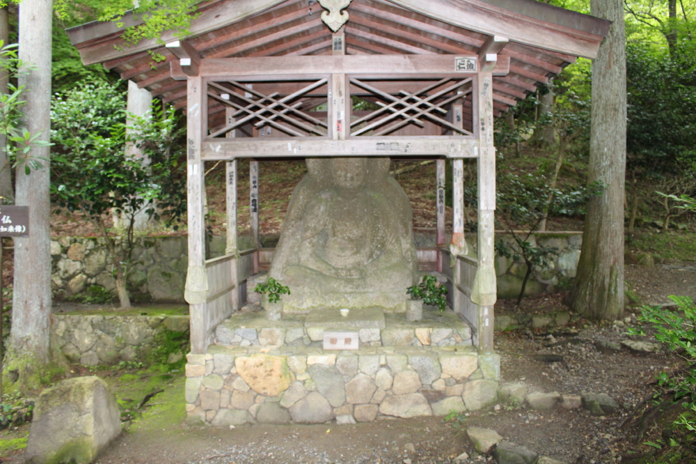 | 庭には池もある。聚碧園を後にして、阿弥陀石仏(売炭翁石仏)を見に行く。途中に延命水がある。律川(りつせん)架かる橋を渡ると、鎌倉あ時代の大仏の様な阿弥陀如来像が鎮座していた。 |