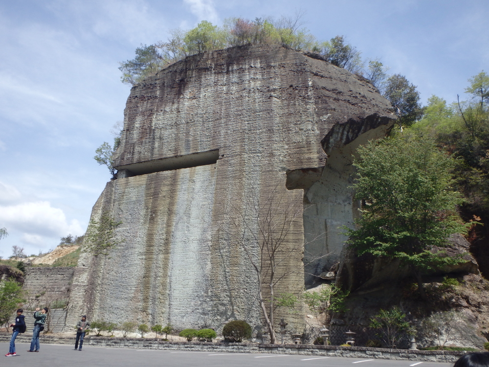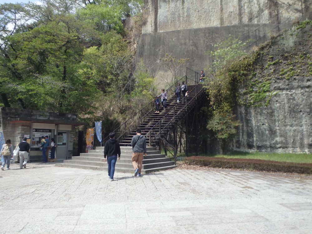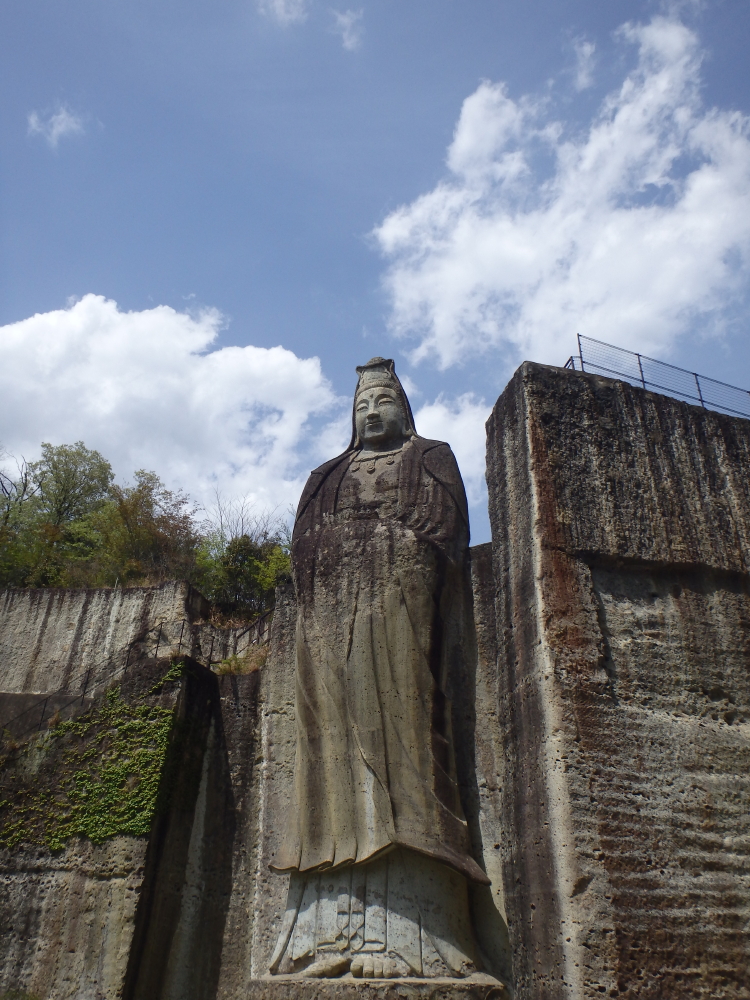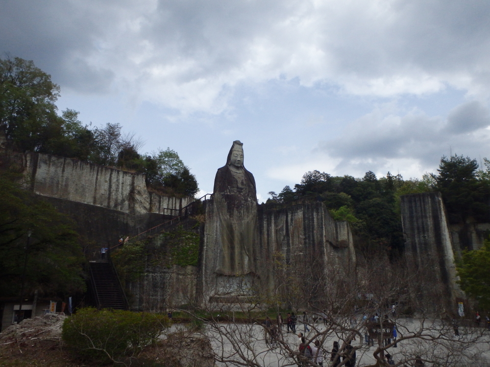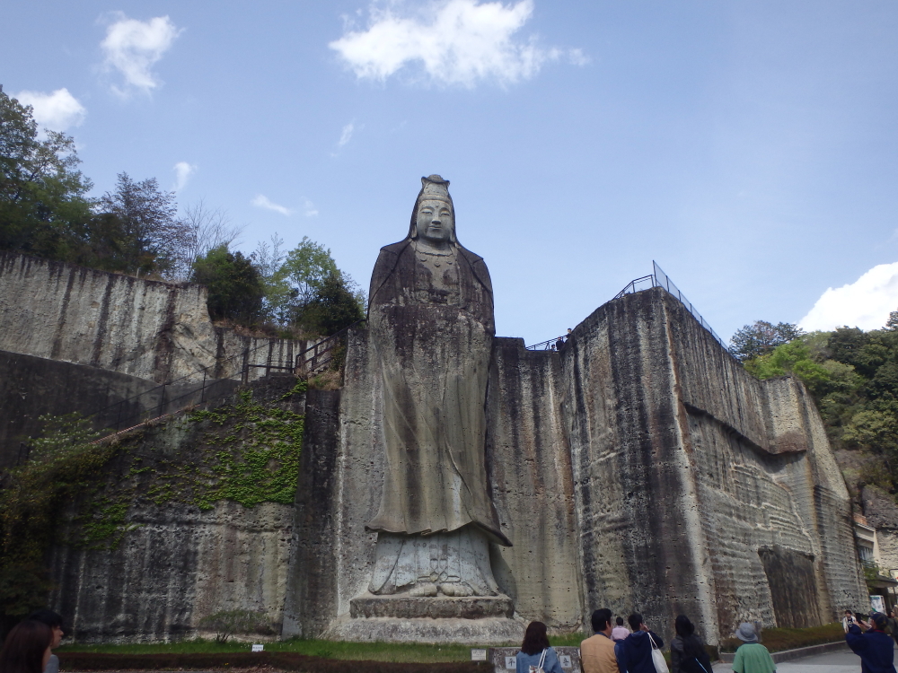 | 大谷公園には高さ27mの平和観音像(大谷磨崖仏)が岩壁を刳り貫いたように立っていた。平和観音は、第二次世界大戦の戦没者の慰霊のために昭和23年に建立されたようだ。観音像の傍に階段があり登って行く。平和観音展望台へは観音像の後ろをぐるっと回って行く。 |