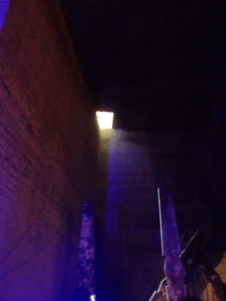 | ライトアップされている所もある。大谷石で作った鬼瓦も展示されていた。外に出ると、石碑があり「石〇羅〇照け/百丈の●●●●●きす/一●」と達筆なので読めない。 |