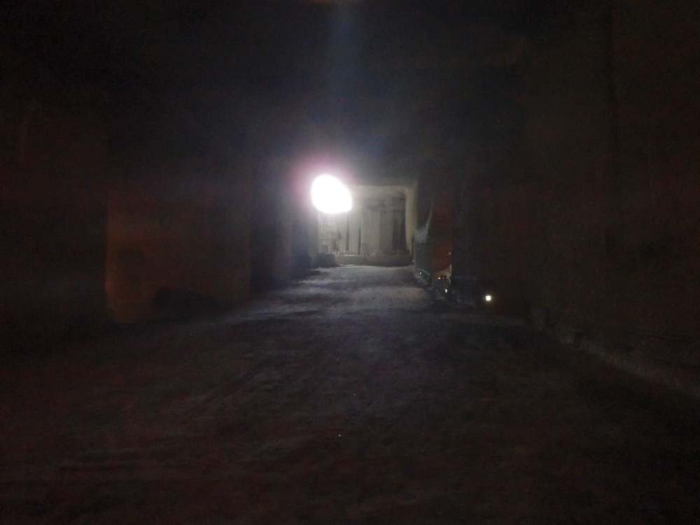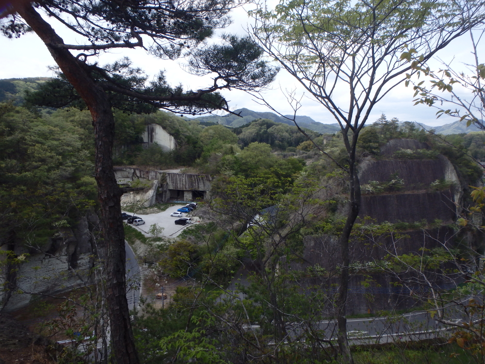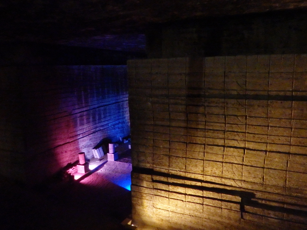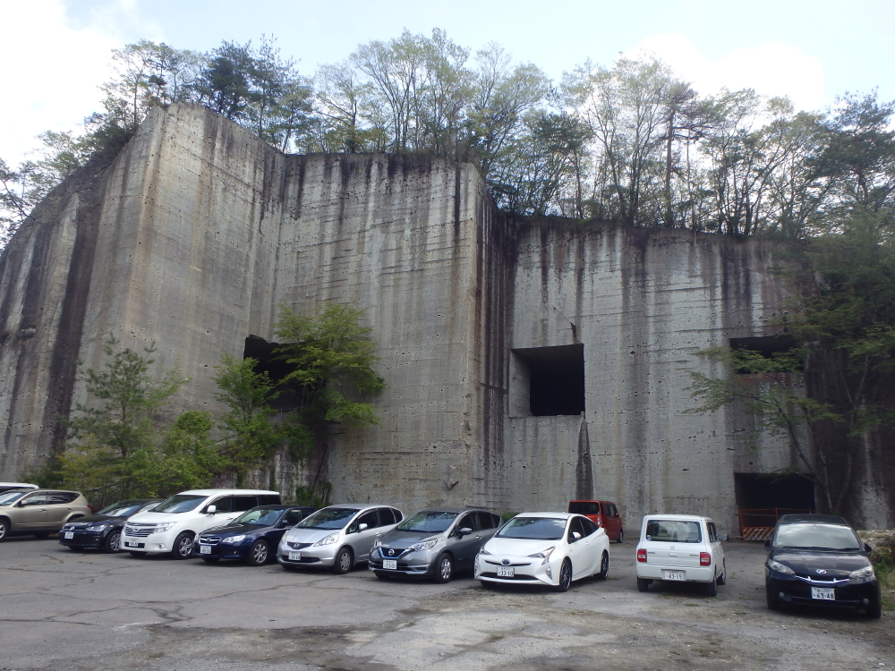 | 駐車場に着くと、石を切り取った大きな石の壁が現れる。その奥に資料館があり、坑道の入口でもある。中に入ると寒いくらいの空気に包まれる。 |