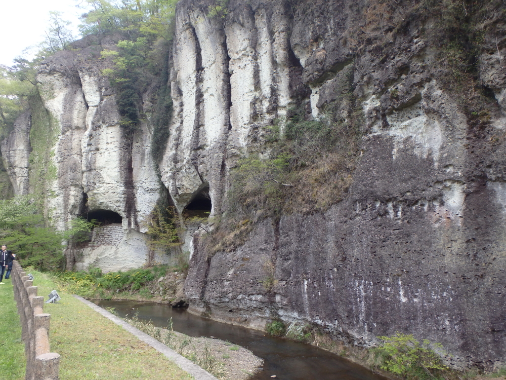 | 駐車場から大谷景観公園の傍を通ると姿川の向こうに御止山の崖が見えて来る。この岩壁にぽっかりと開いた洞があり、これをセンニン洞という様だ。大谷寺の仁王門を潜って境内にはいると、三つ葉葵の寺院幕が垂れた大谷観音堂が岩の中に収まっていた。 |
