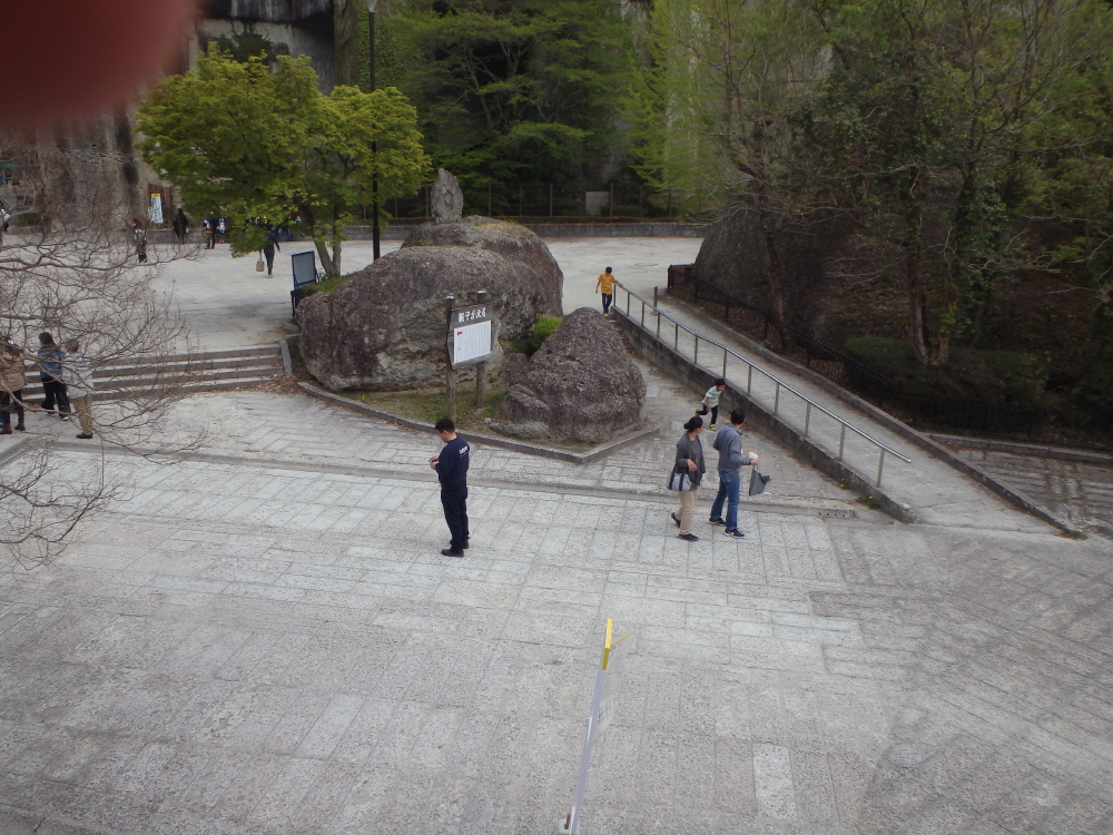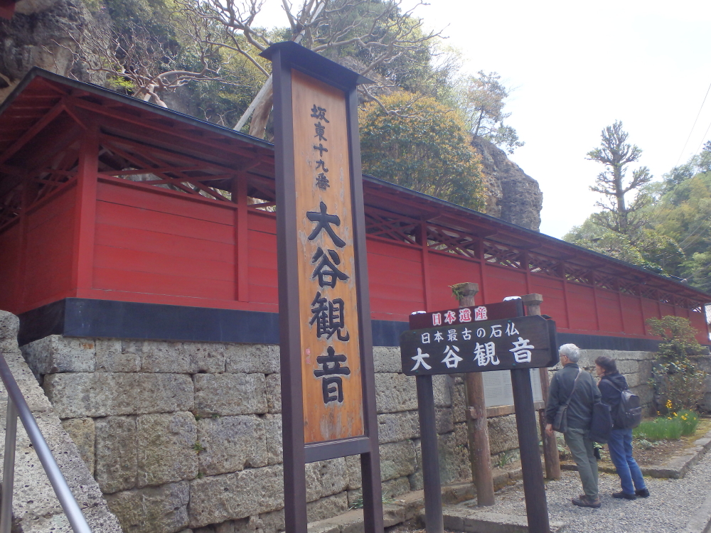 | 大きな岩の縁を辿って行くと開けた所もある。仁王門に戻って、大谷観音等の解説を見る。 |