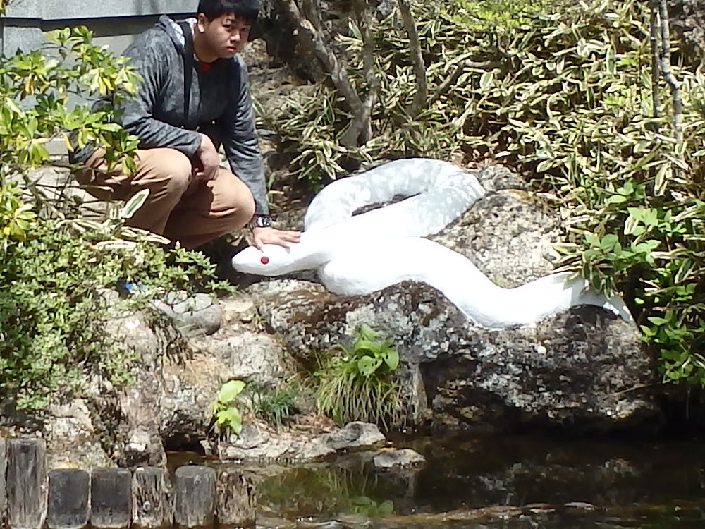 | 境内には池があり橋を渡ると弁天堂がある。お堂の傍には白蛇の置物が鎮座していた。 |