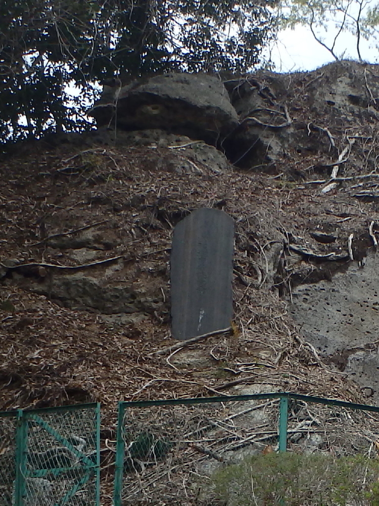 | 弁天堂の脇から御止山に登る登山口がある。登って行くと、解説板が立っていた。登るにつれて下界が見えてくる。真下に姿川、その傍に大谷街道、奥に四角い採石の跡のある平らなヘリポートが見えていた。ピークがわからないまま奥に進むと、明治時代の石碑が鎮座していた。どうやら、大正天皇の皇太子時代の碑のようだ。 |