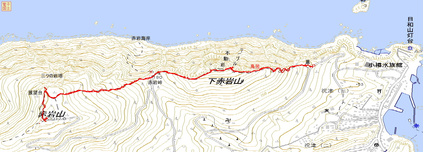 ポイント 綺麗な海と奇岩群の調和がとれた海岸線に沿って歩く。赤岩山と下赤岩山の散策路は、オタモイ峠(唐門)、山中峠(出羽三山神社)、赤岩峠(白竜神社)、赤岩峠(作業道)、Hノイシュロス小樽に入口がある。2山を回るならHノイシュロス小樽の入口から取り付くのが一般的と思う。 赤岩山の頂上はパラボラアンテナ群の所であるが、展望台の方がベンチがあり景色も良い。展望台から海側に踏み跡があり、辿ると三ツの岩塔や海が眼下に見える(標識なし、穴場)。 赤岩山は西赤岩山、下赤岩山は東赤岩山と呼ばれることもある。下赤岩山には白竜胎内巡りが出来るが、ハイキング感覚では無理だ。 |