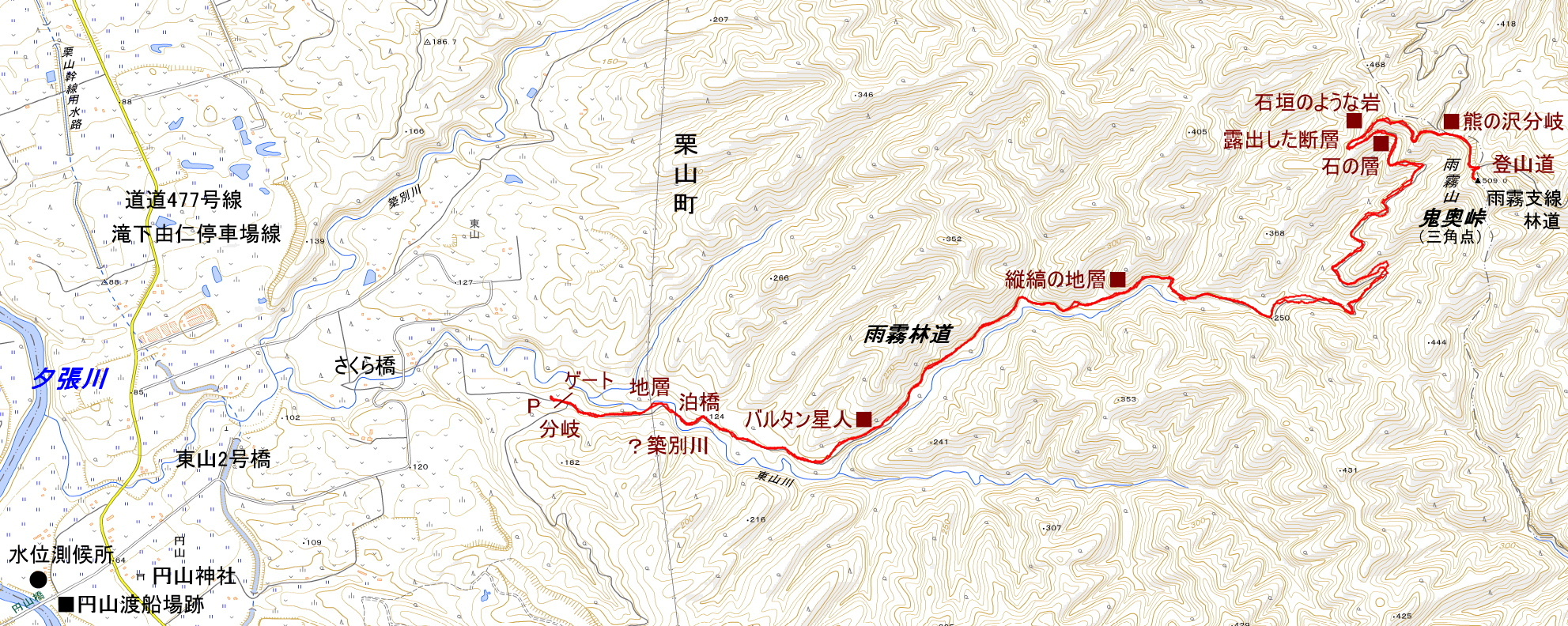 アクセス 国道274号線(三川国道)から町道へ入り、「夕張川」に架かる「円山橋」を渡り道道274号線を横断して、栗山幹線用水路に架かる東山2号橋を渡り、Uターンするような格好で沢へ下りて行く。東山川に架かるさくら橋を渡ると直ぐ右手に林道入口がある。この林道は農道の様でもあり、ビニールハウスを見ながら奥へ進む。林道入口には駐車スペースがないので、堆肥場と畑の間に停めさせていただく。 国土地理院地図 Google Map 登山道地図クリック大→| |