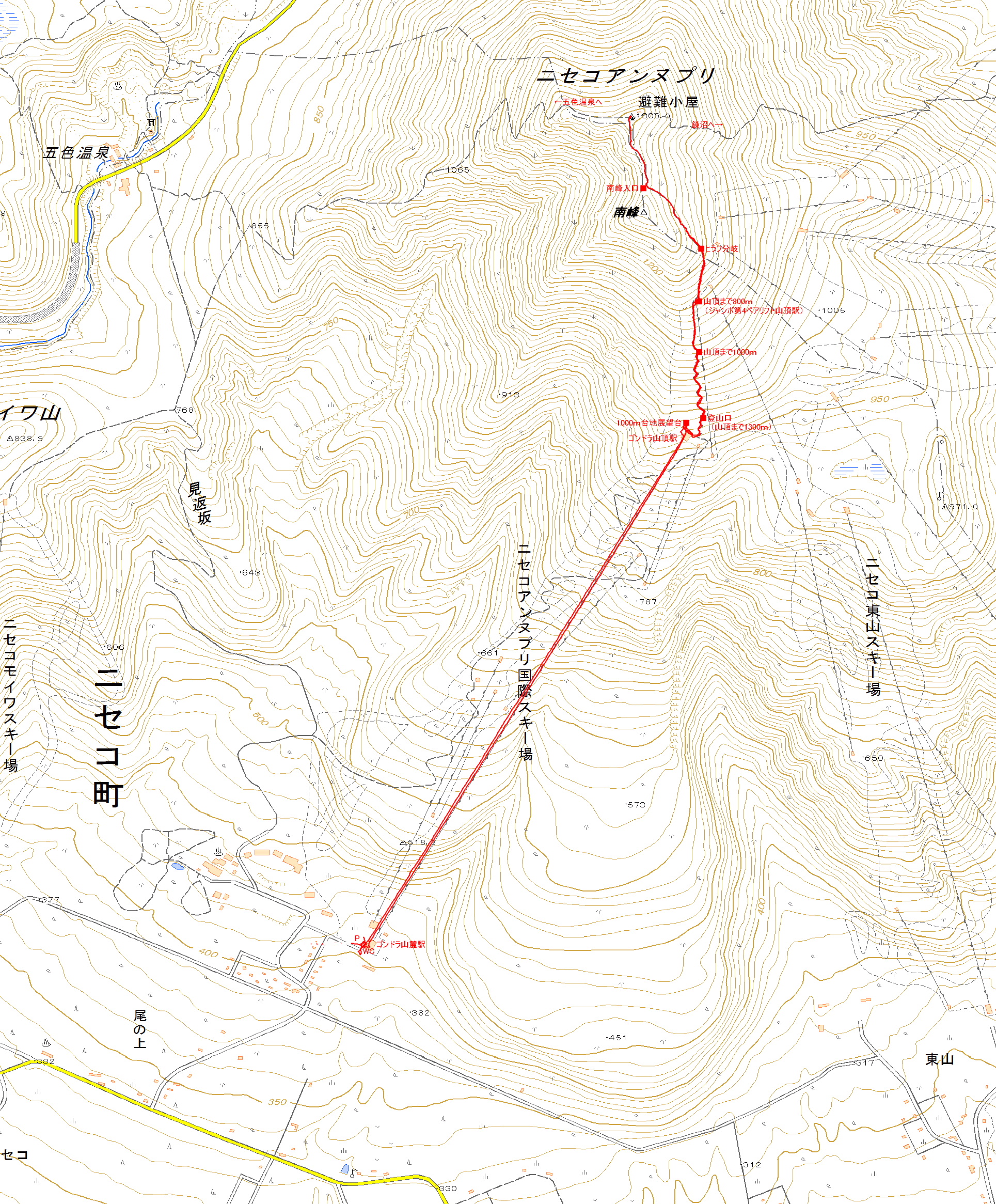 アクセス(カーナビ入力:ゴンドラ0136-58-2080) ニセコアンヌプリ国際スキー場を目指し、夏季運行のゴンドラに乗り1000m台地の登山口に行く。 国土地理院地図 Google Map 登山道地図クリック大→| |