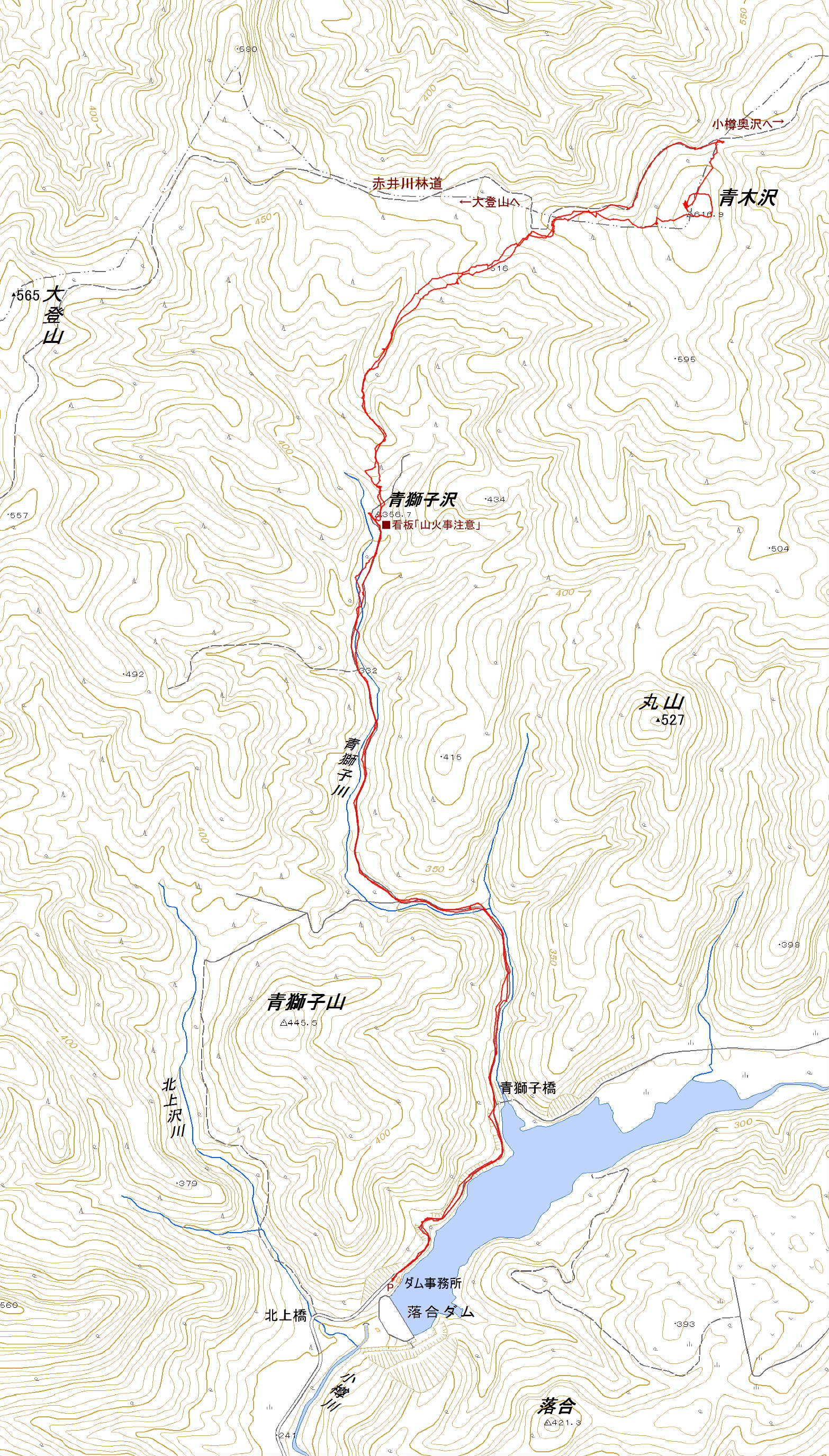 | 落合ダム | 「あおじしはし」手前を | 青獅子川の流れ | 434mのコブを |