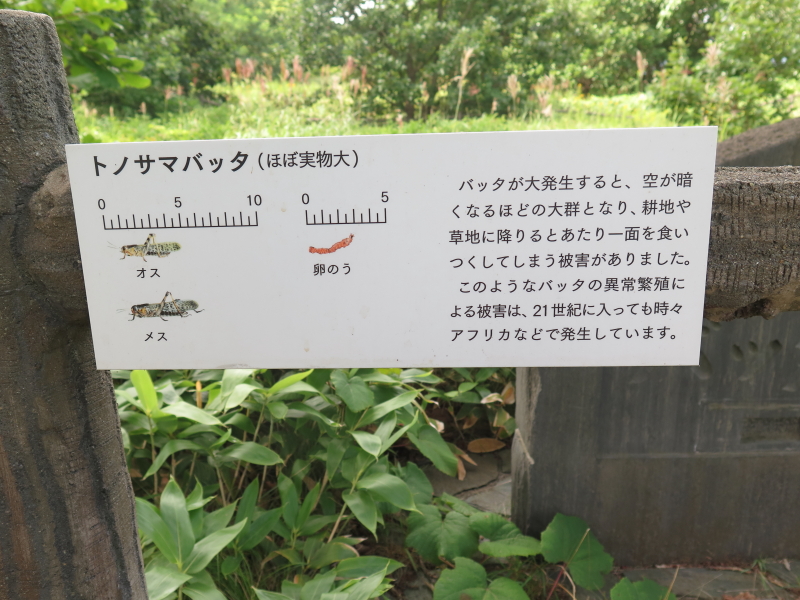 | バッタの原寸大の図 | 記念碑の裏に | 由緒書き | 畝状のバッタ塚 |