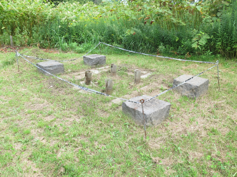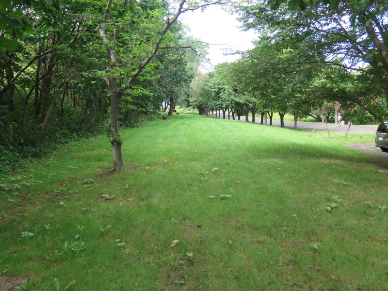 | 夏草が生い茂る裏玄関から、砂利を新たに敷いた道を辿ると、舗装した駐車場に出る。駐車場から北側に付けられた道を辿ると、ベンチや東屋がある公園の一角に、バッタ塚がある。石碑には「手稲町山口バッタ塚」と彫られている。 |