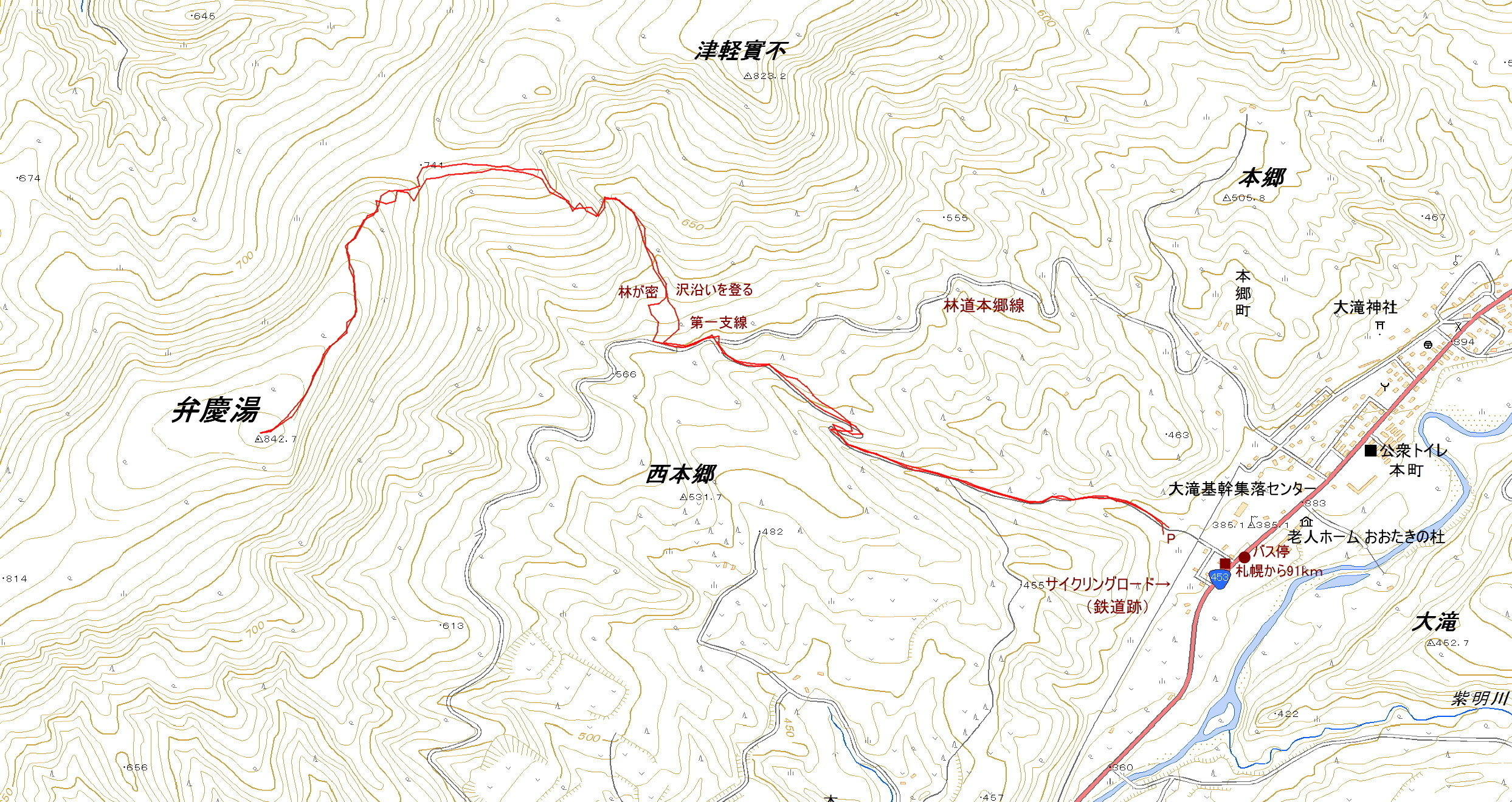 アクセス 国道453号線を北から本郷町に入ると道路を挟んで大滝基幹集落センターと老人ホームおおたきの杜がある。これらを過ぎると集落センター前のバス停と札幌から91kmの看板の間の道を右折して山へ向う。自転車道路(胆振線跡)を横切り、奥へ進むと舗装が切れ除雪終点となる。 国土地理院地図 Google マップ ルート地図(2006.3.25)クリック大→┃ |