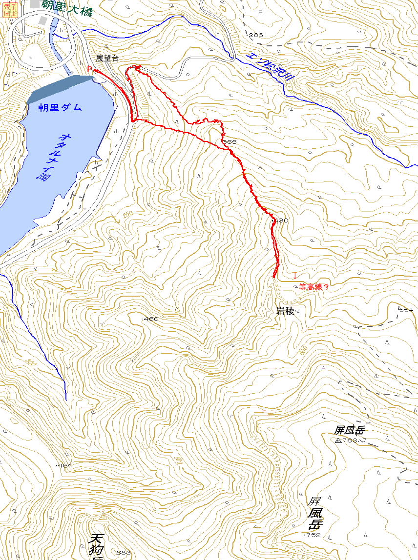 アクセス 小樽定山渓(道道1号)線の「朝里ダム展望台」駐車場(通常3台まで、縦列すると6台程度)に車を停める。 国土地理院地図 Google マップ ルート図(2013.2.1)大→┃ |