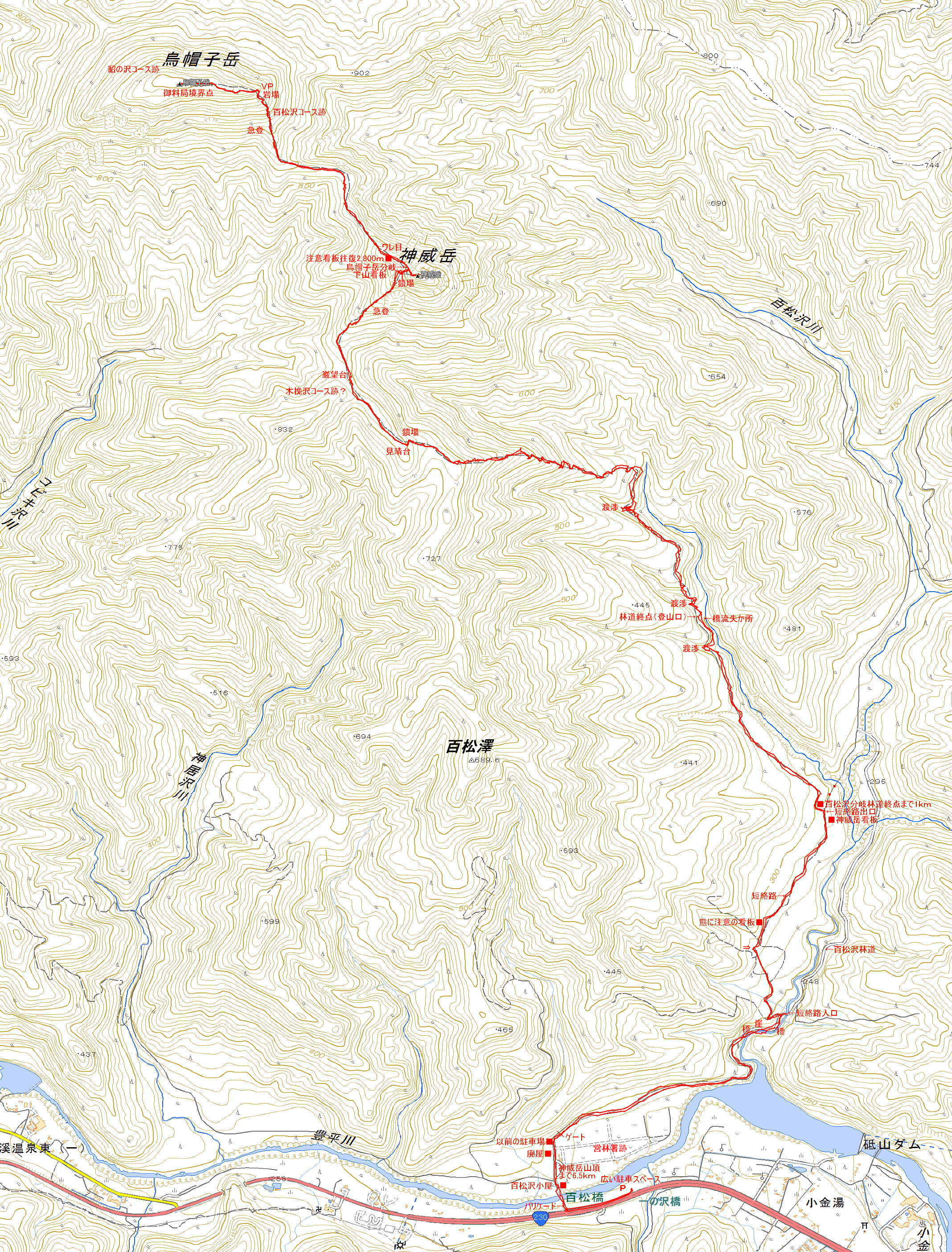 | 豊平川にかかる百松橋を渡ると、右側に百松沢小屋があり、登山届のポストがある。記帳を済ませて、右に営林署の建物を見て奥へ進むと、左に駐車場がある(現在は百松橋は通行止め)。 出発しようと思っていると、一人の男性が到着し準備を始めた。その男性に何処まで行くのか聞いてみたら、足が向けば烏帽子岳まで行くという。私も烏帽子岳まで行くので心強い。ドラツグミの変な鳴き声を聞きながら林道歩を歩き始めると、間もなく砥山ダムに差しかかる。水面の綺麗なダムの奥に、三角形の焼山が見える。途中の沢も中々綺麗な流れで、プールの様になっている流れのところもあり、誰かが下りて遊んでいる跡もある。 林道を15分位進むと、左に神威岳の標識が現れる。その標識に従って短絡路(林道をワープ)に入る。この短絡路は15分位でもとの林道に出る。短絡路の出口には立派な看板が設置されていた。そこを左に曲がり、20分位で林道が川に突き当たる。この川の左側に、登山口がある。この辺りが以前と比べると、すっかり変わったような気がする。 |