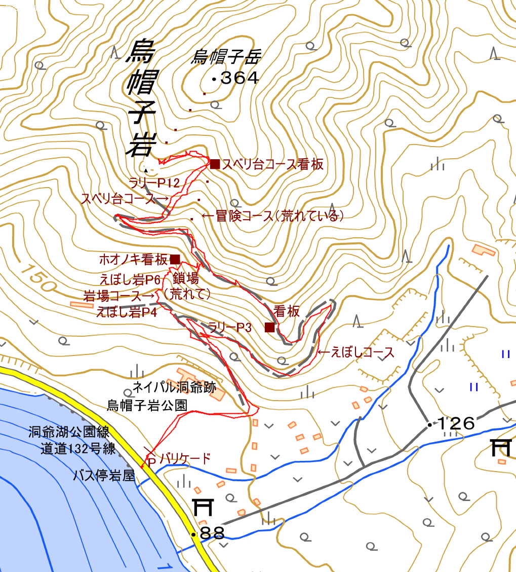 ポイント 烏帽子岳(364m)の南側に位置し、洞爺湖が望める。烏帽子岩から烏帽子山364mへ踏み跡があるようだ。 |