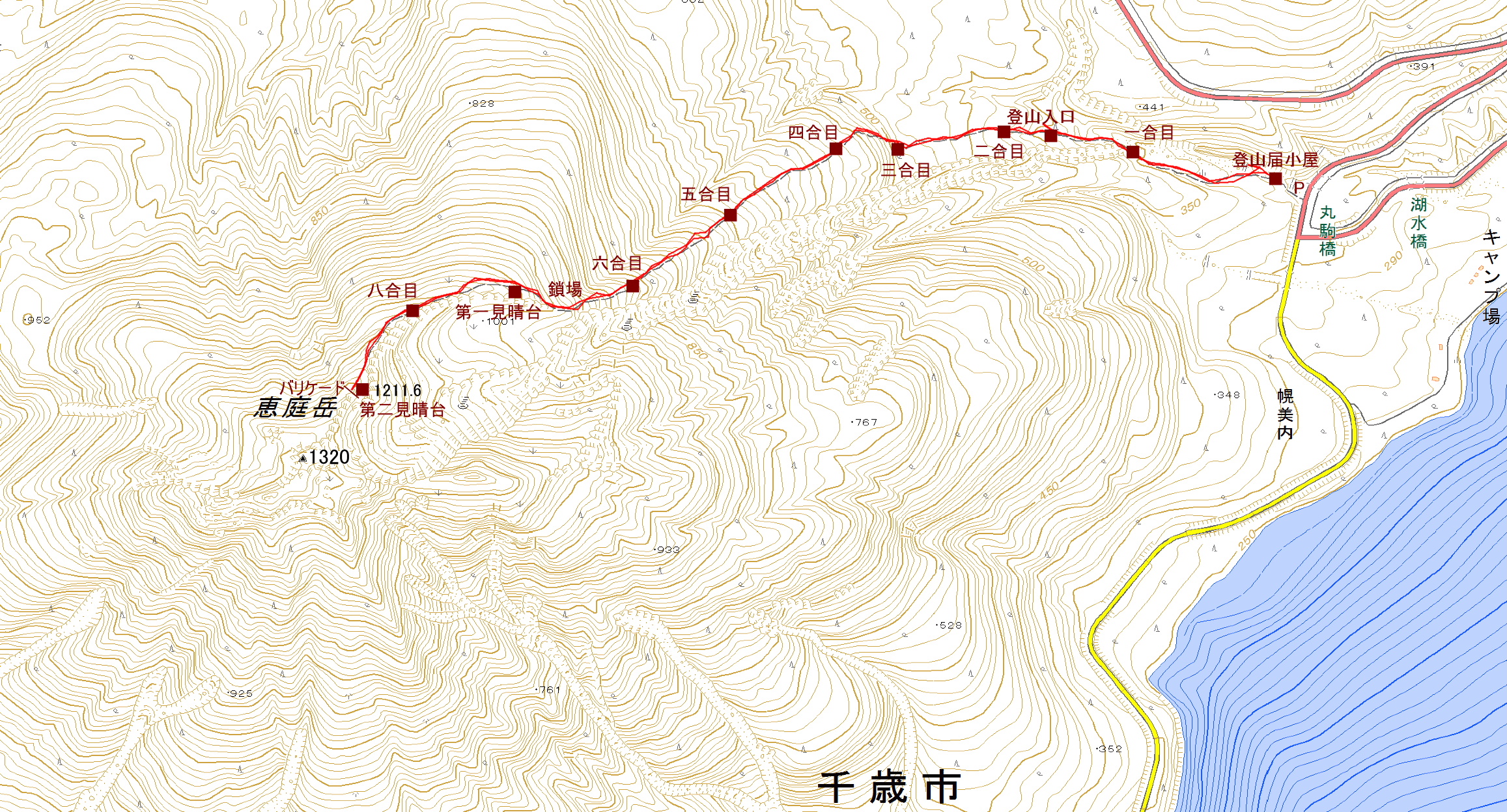 アクセス 道道453号線を札幌から支笏湖に向うと、ヘアピンカーブ(イチャンコッペ山の登山口)を通過する。次に丸駒(道道730号)線の手前に丸駒橋があり、渡ると右に恵庭岳登山口の看板が立っている。現在の登山口は、道路沿いになった。 |