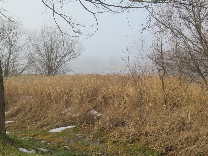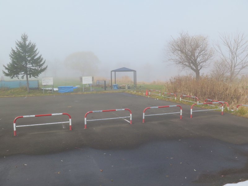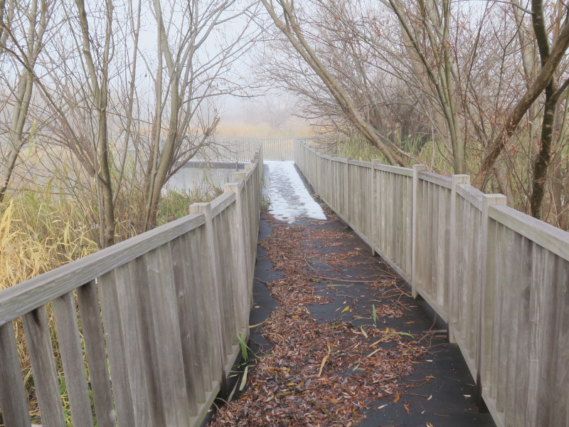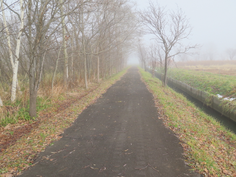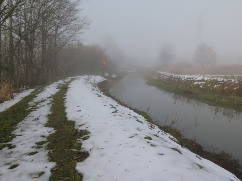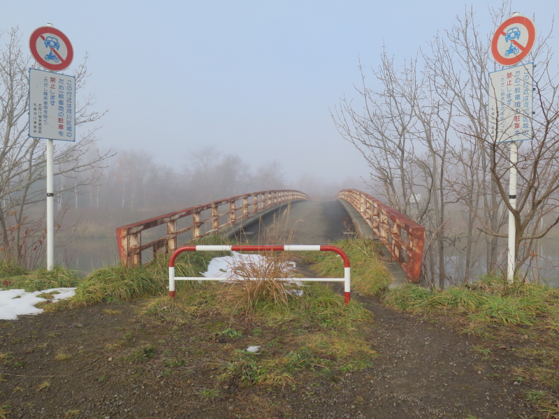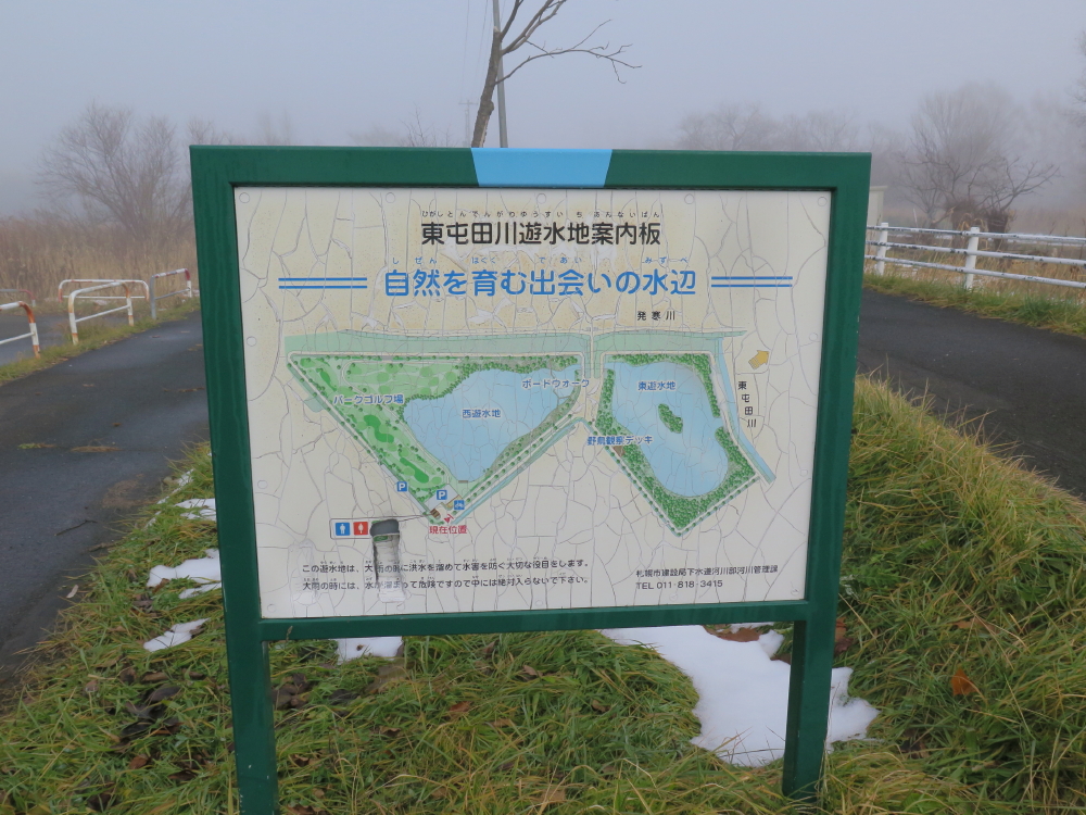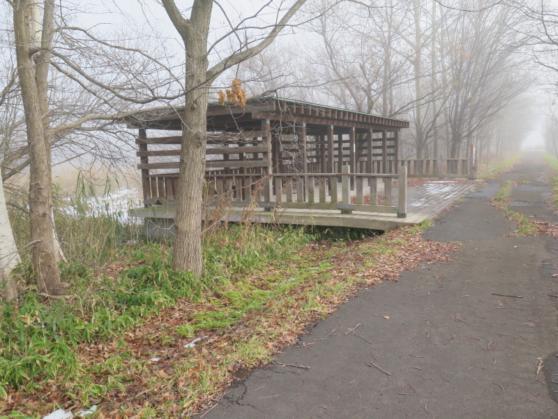 | 今日は晴れの天気予報で、愛棒も調子がよさそうだったので出かける。クマ出没のしないだろうと思い平らな東屯田川遊水地を選ぶ。屯田近くなったら霧が出てきて、遊水地に着いても晴れなかった。霧に包まれた駐車場の奥にはパークゴルフ場があるはずだが、東屋がわずかに見える程度だった。駐車場の傍には案内板があるのでよく見る。案内板に向かって左はサイクリングロードと遊歩道、右は作業道の様だった。まず、反時計回りに辿ろうと遊歩道に入る。西遊水地の傍を辿っているのだが、池は霧に包まれたままだった。それでも、僅かに池が見える所に来ると、ボードウォークの入口があった。ボードウォークは西遊水地の北側の一角に8の字に設置されていた。板の上には落ち葉と雪が積もっていた。板は水面から数センチ上にあるが、これ以上水位が上がると通れなくなるかもしれない。 |