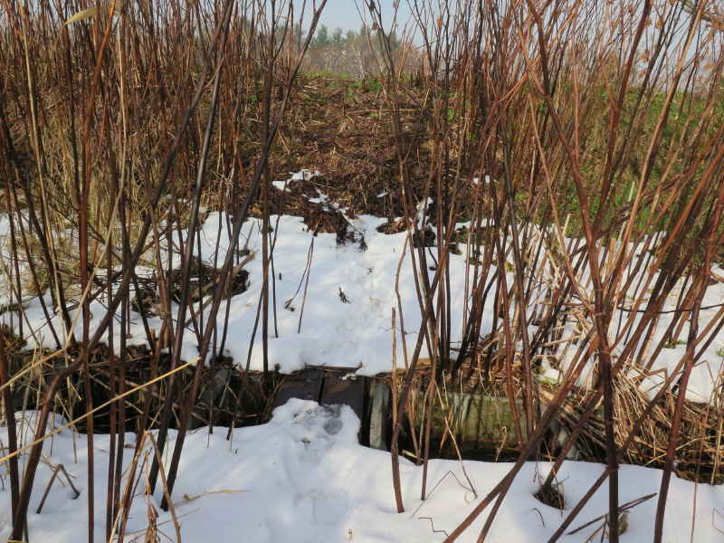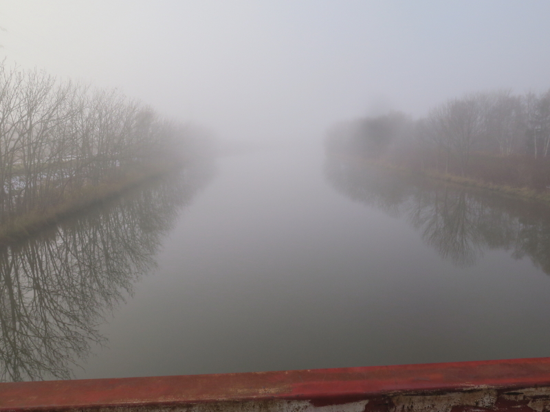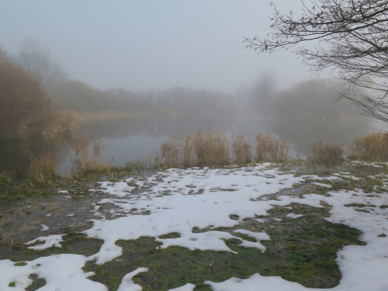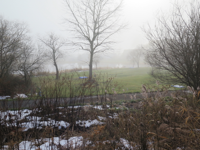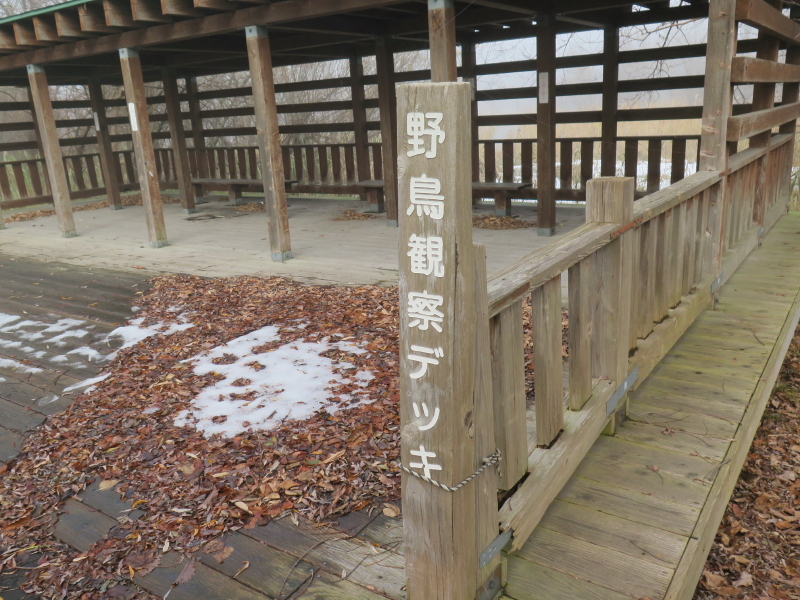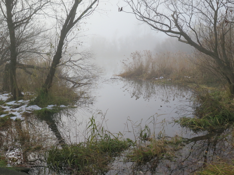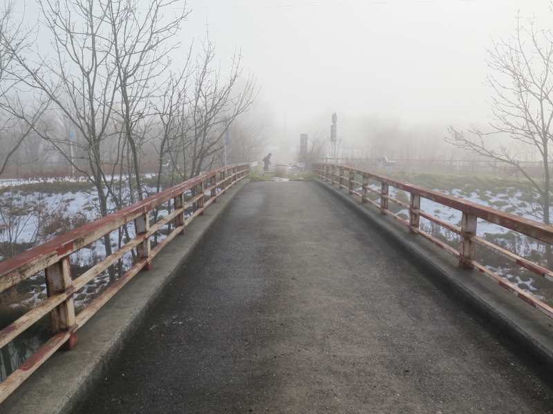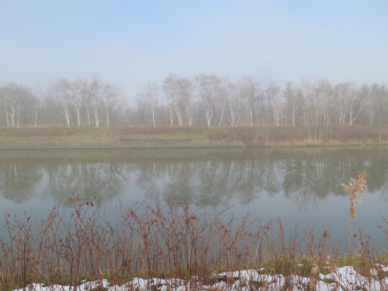 | 今日は晴れの天気予報で、愛棒も調子がよさそうだったので出かける。クマ出没のしないだろうと思い平らな東屯田川遊水地を選ぶ。屯田近くなったら霧が出てきて、遊水地に着いても晴れなかった。霧に包まれた駐車場の奥にはパークゴルフ場があるはずだが、東屋がわずかに見える程度だった。駐車場の傍には案内板があるのでよく見る。案内板に向かって左はサイクリングロードと遊歩道、右は作業道の様だった。まず、反時計回りに辿ろうと遊歩道に入る。西遊水地の傍を辿っているのだが、池は霧に包まれたままだった。それでも、僅かに池が見える所に来ると、ボードウォークの入口があった。ボードウォークは西遊水地の北側の一角に8の字に設置されていた。板の上には落ち葉と雪が積もっていた。板は水面から数センチ上にあるが、これ以上水位が上がると通れなくなるかもしれない。 |