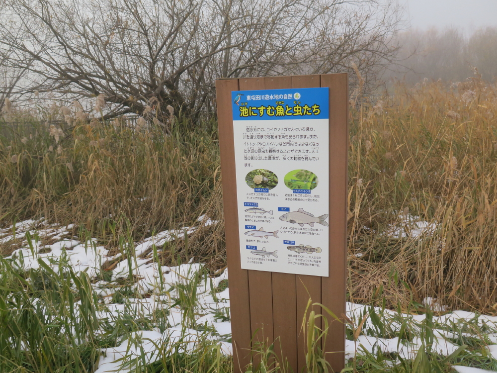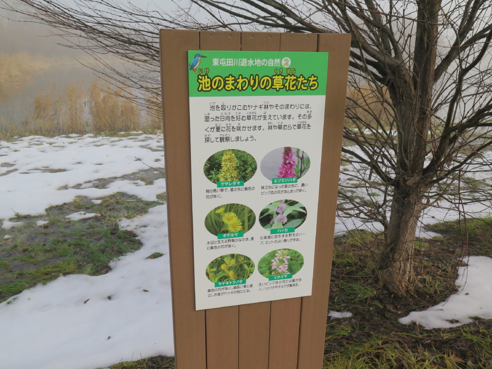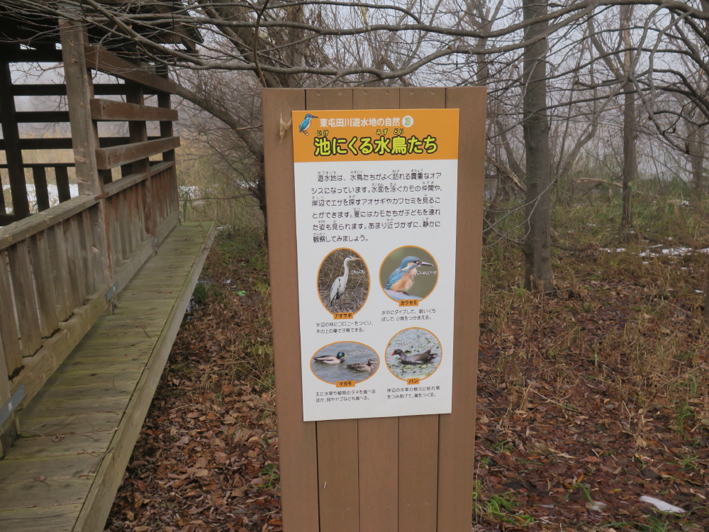 | デッキの傍には解説板B「池にくる水鳥たち」があり、絵の中に鳥の鳴き声も書かれていた。アオサギ(ギャ、ギャ)、カワセミ(チーツ、チーツ)、マガモ(クワツ、クワツ)、バン(クルルッ)らしい。舗装の作業道を曲がると、東屯田川沿いになり、雪も積もっていた。 |