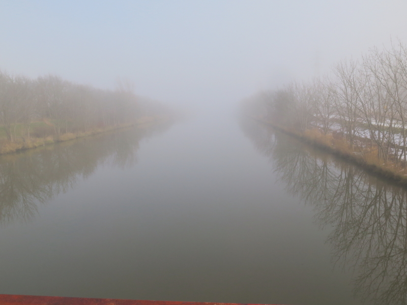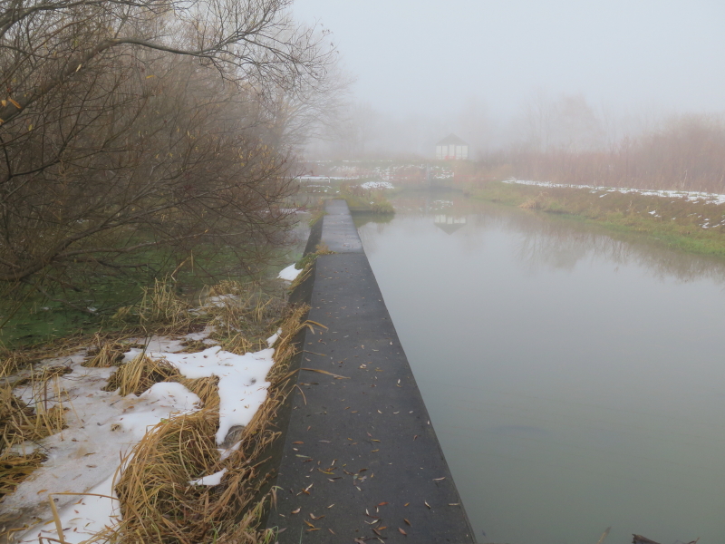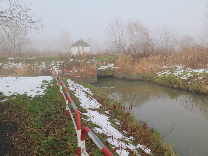| 水門からは木立が開け東遊水地が見える。道は無くなり堤防の上を歩く。洪水の時にはここから水が流入するのだろうか。河川管理施設もあり発寒川の水門もある。水門に近づくと、また道になり発寒川と東屯田川が平行してくる。再び、東西の遊水地の間にある広場にでる。地下で東西の池が繋がっていると思われる所から東遊水地が眺められるが、霧で中の島が見えなかった。 |