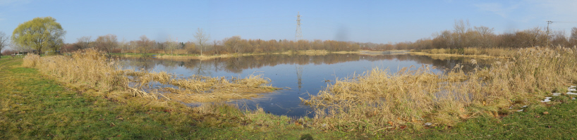 | 西遊水地に着くと、霧も無くなり西遊水地が一望された。水面には鉄塔も映えていた。 |