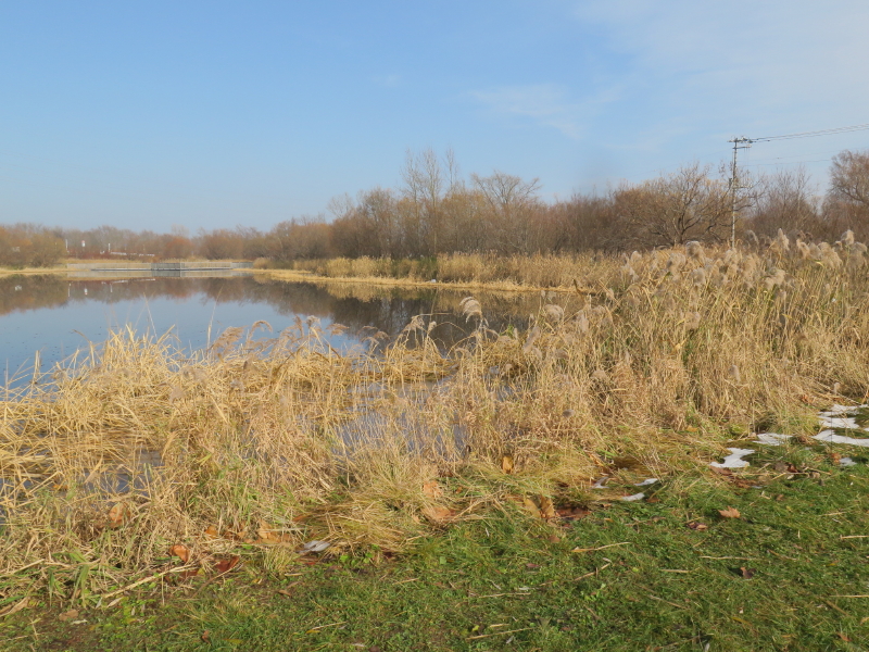 | ボードウォークから西遊水地が見えだして来た。ボードウォークの入口には解説板@「池に見られる水草たち」が設置されている。この池には岸辺にはヨシ、マコモ、水面に浮かぶヒシ、水中のシャジクモが代表的なようだ。解説板C「池にすも魚と虫たち」には、コオイムシ、セスジイトトンボ、イバラトミオ、コイ、ウグイ、モッコ、ウキゴリが解説られていた。東遊水地の南側の道路を辿ると、野鳥観察デッキがある。 |
