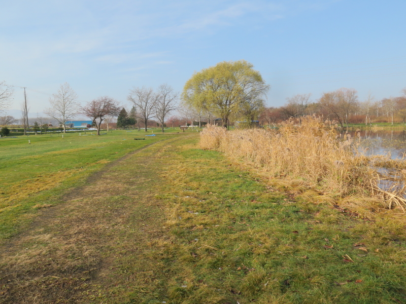 | しかし、パークゴルフ場へ下る所が無いので、先程のバイパスに戻り、細くなった東屯田川に架かる鉄板の橋を渡る。バイパスは鉄塔脇にあった。舗装道路を辿って行くと、一般道路に出てしまうので、法面を下り鉄板の橋を渡る。パークゴルフ場の中を通り、駐車場に向かって岸辺を歩いて行く。 |