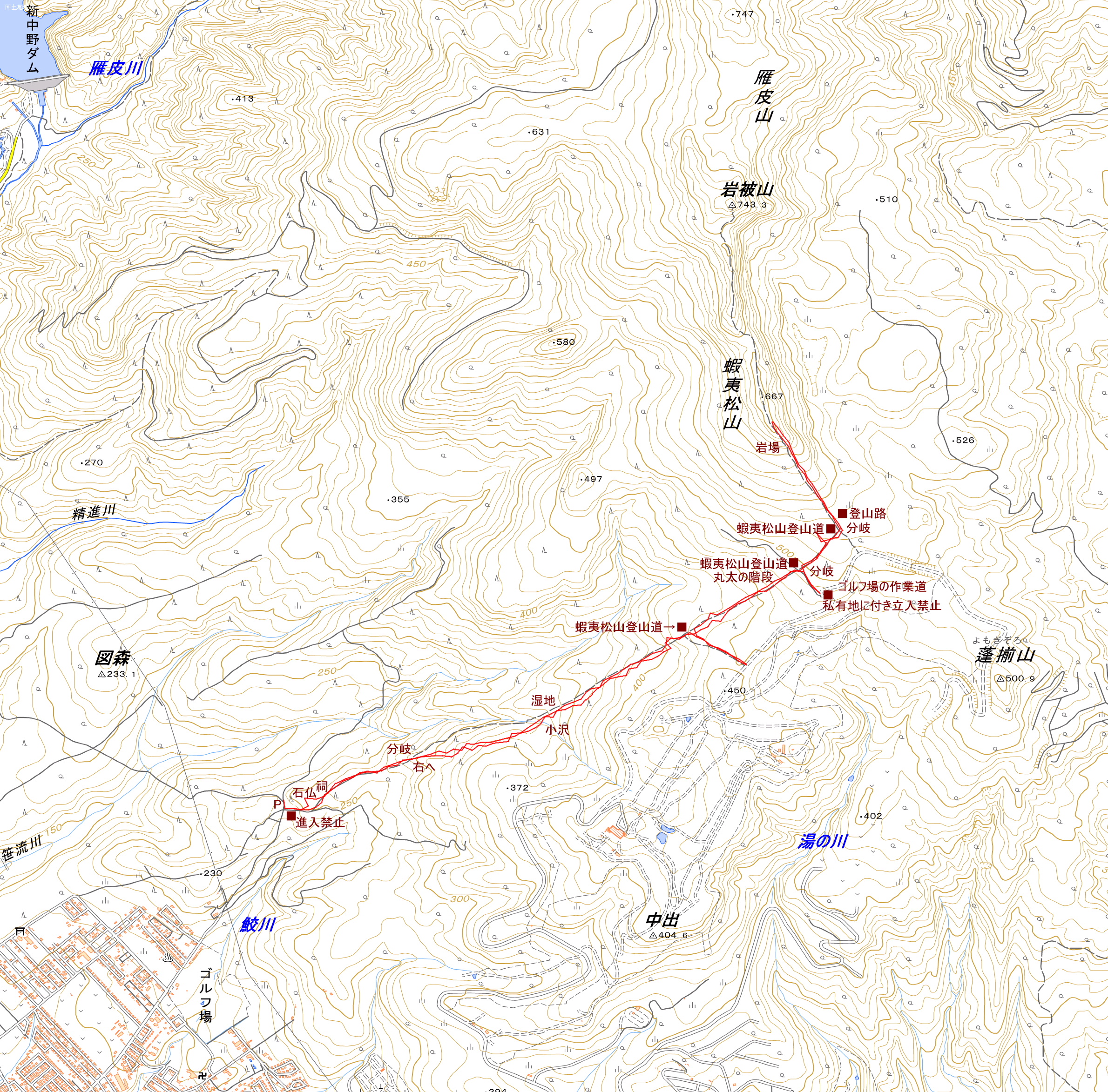 | アクセス(カーナビ入力:陣川温泉) 四稜郭を目指し、次に陣川温泉(パークゴルフ場)を目指す。陣川温泉の奥に伸びる砂利道には大きな木がある。この木を通り越し送電線を潜りながら、少し荒れた道を辿ると真ん中にお地蔵さんと木があり、左右にお地蔵さんが立っている十字路に着く。ここの空き地に駐車する。 右側の進入禁止の看板のある道が登山口となる。進入禁止の看板にはエゾマツ山とマジックで書かれている。 |