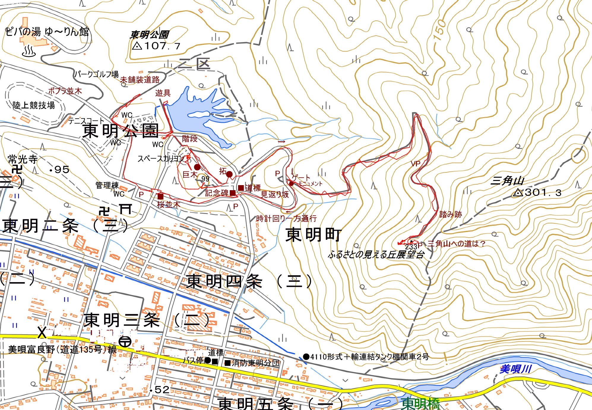 アクセス 美唄富良野(道道135号:富良野には通じていない)線を東に向かって走る。美唄IC北側のアンダーパスを抜け、美唄市消防本部東明分団詰所の手前を道標に従い左に入る。公園内には駐車場が3か所ある。 国土地理院地図 Google Map 登山道地図クリック大→| |