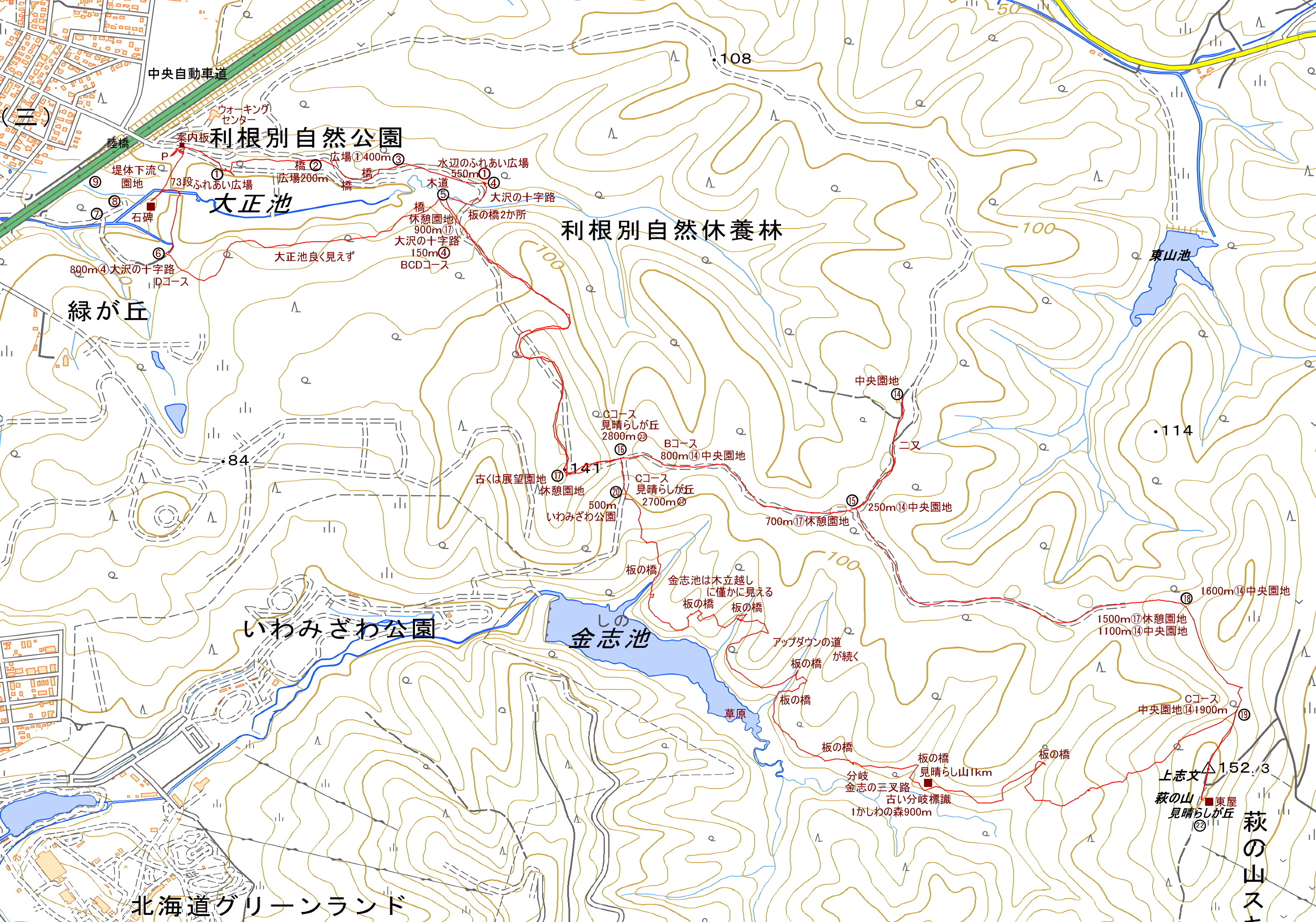 ポイント 利根別自然休養林には、大正池や金志池がある。その周囲の尾根には、かしわの森、四国八十八ケ所(157m)、見晴らしが丘、園内には休憩園地(141m)がある。その中で山らしいのは見晴らしが丘で萩の山とも呼ばれている。金志池沿いの遊歩道は運動靴では厳しい。 |