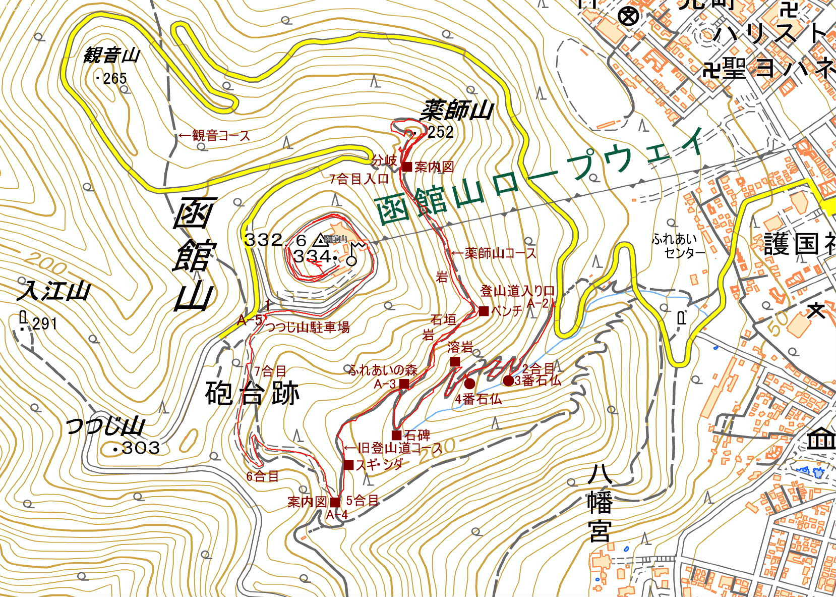 ポイント 函館山は大雪山と同じように、13ピークを総称して呼ばれている。山頂標識が無い山や閉鎖されている山もある。案内図や道標の呼称が統一されていないので分かり難い。 ピークが多いのでその分、登山ルートも多く、家族の好みや持ち時間に合わせて楽しめる。低山なのに花が豊富で、要塞遺構など歴史の実感も味わえる。 ハイキングコースマップ(ロープウェイHP) |