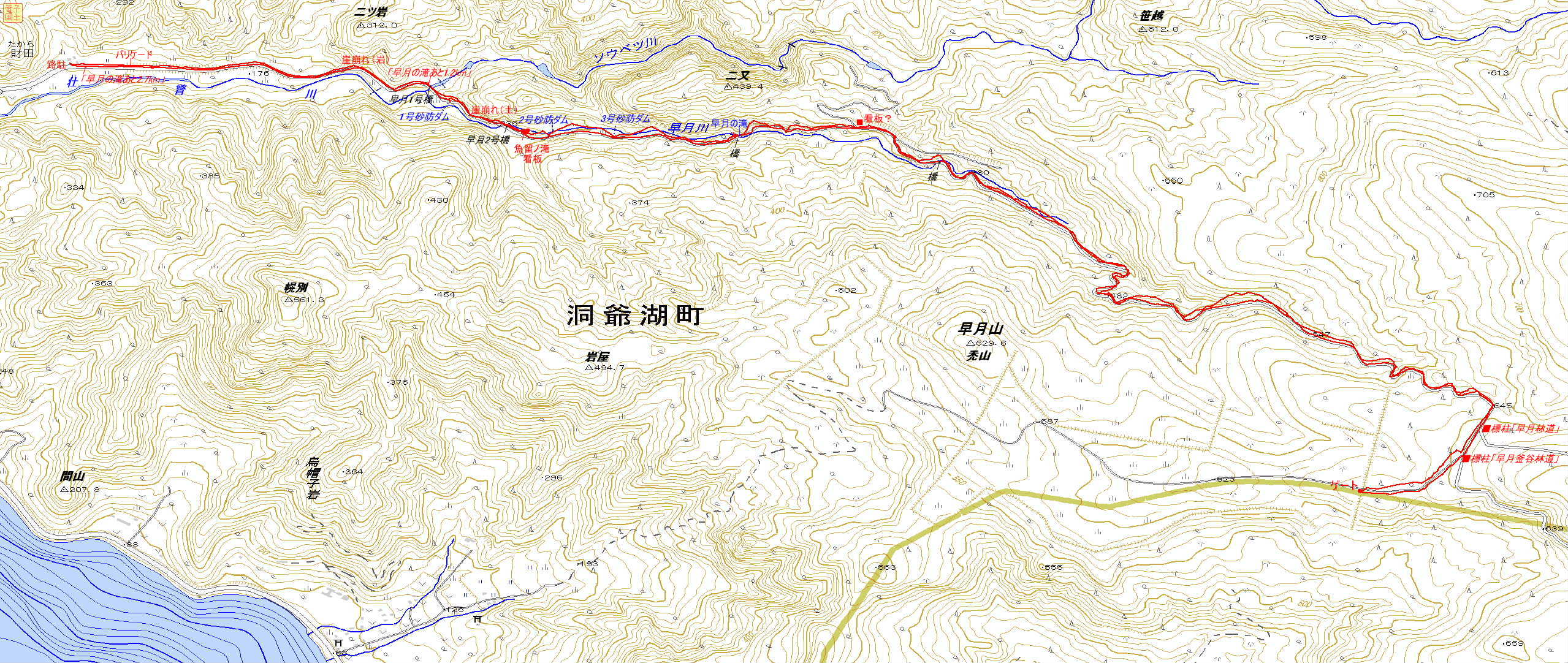 アクセス 札幌から国道230号線を走り、大原から洞爺湖の湖畔道路(村道132号線)を壮瞥方向へ向かう。「早月」の道路標識にしたがい、左折する。舗装が切れた最終人家前に、「早月の滝あと2.7km」の標識があるが、「全面通行止」の看板も立っている。インターネットで検索した時には、滝まで車で行け遊歩道もあることになっていたが、状況は全く違っているように感じられた。仕方がなく、邪魔にならないように舗装道路の路肩に停める。 国土地理院地図 Google マップ 登山道地図クリック大→┃ |