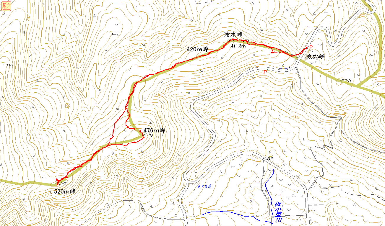 | 520m峰を後に | 476m峰をトラバース | 421m峰へ登り返し | 三角点通過 |