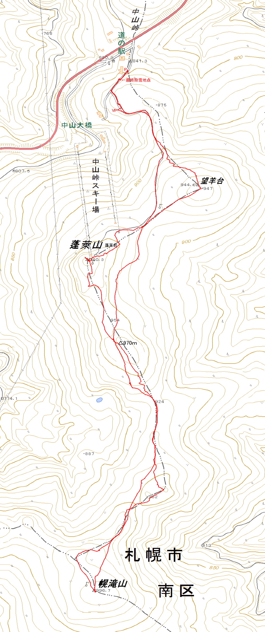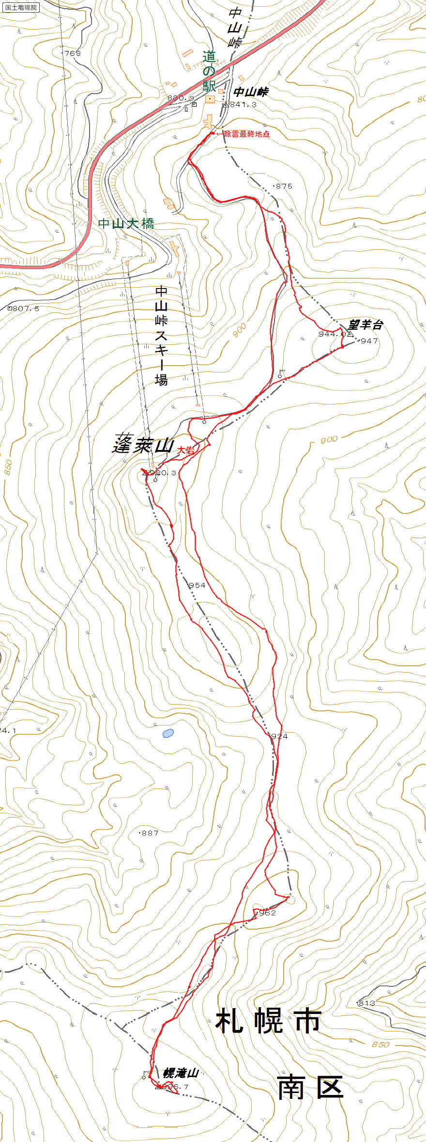 二人の山行記録 2019(H31)年3月18日(月) 晴れたり曇ったり 硬雪ラッセル無し 往復スキー10.147km 登り2:08 下り1:06 7:37除雪最終地点→8:17望羊台→8:42蓬莱山8:45→9:03P970m→9:26P962m→9:48幌滝山9:59→10:06col952m→10:18col924m→10:36col954m→10:48col930m→11:05除雪最終地点 2015(H27)年4月23日(木) 晴れ 硬雪ラッセル無し 往復スキー10.140km 登り2:08 下り1:06 7:56除雪最終地点→8:36望羊台→9:04蓬莱山9:12→9:52P962m→10:12幌滝山10:42→10:53P962m→11:26蓬莱山→11:48除雪最終地点 2002(H14)年4月21日(日) 晴れ スキー 硬雪 ラッセル無し 登り1:32 下り1:10 9:31体育館→9:55望羊台→10:20蓬莱山10:35→11:03P962m→11:18幌滝山12:08→11:21P962m→12:56蓬莱山→13:18体育館 |