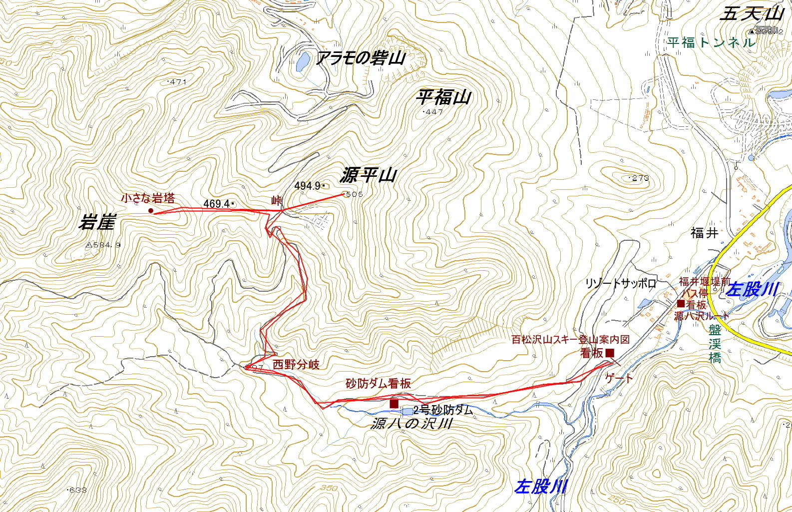 ポイント 源八の沢の林道はスノーモビルランドのコースになっているので、衝突等の事故に注意すること。505m峰の頂上は藪で残念ながら市街地は木立越しに少し見えるだけの山。 |