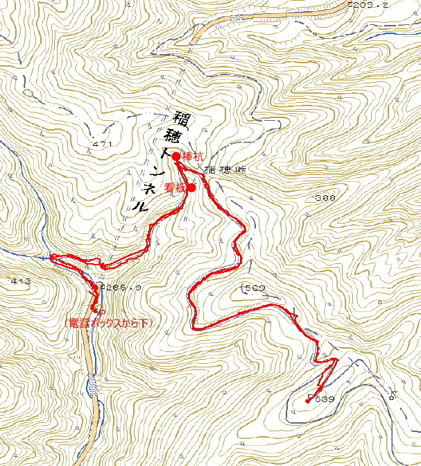 | 植林の標識か | 沢のポール | 峠へ | 稲穂峠 |