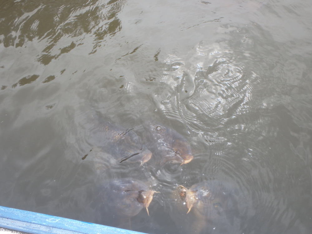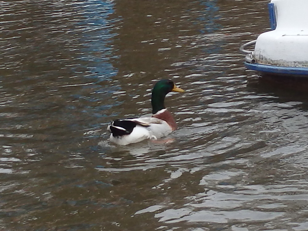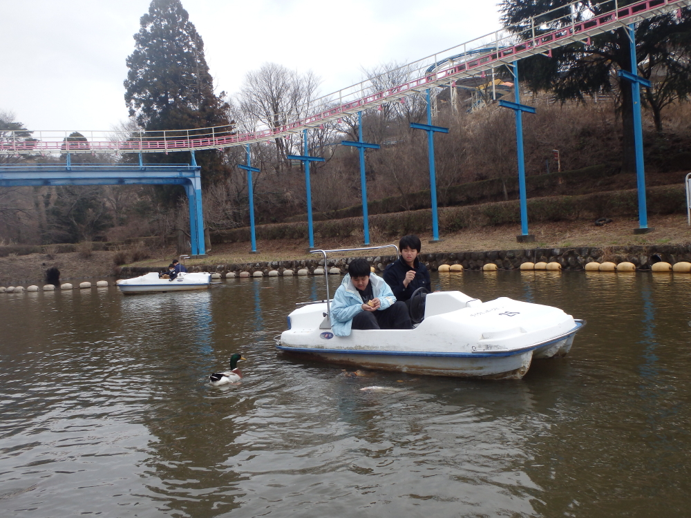 | どじょう池には水上自転車があり足で漕いで進むと、後ろからマガモが着いて来た。餌をやると、ドジョウではなくコイも口をパクパクさせていた。 |