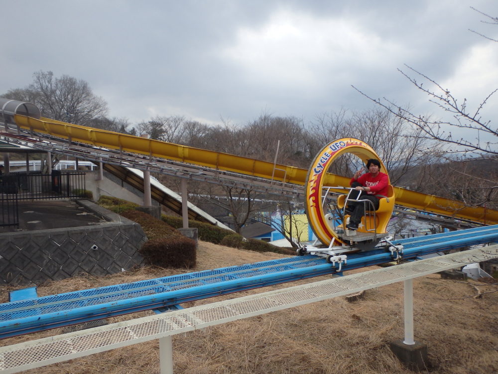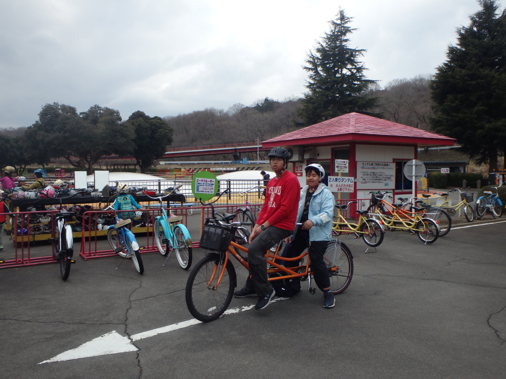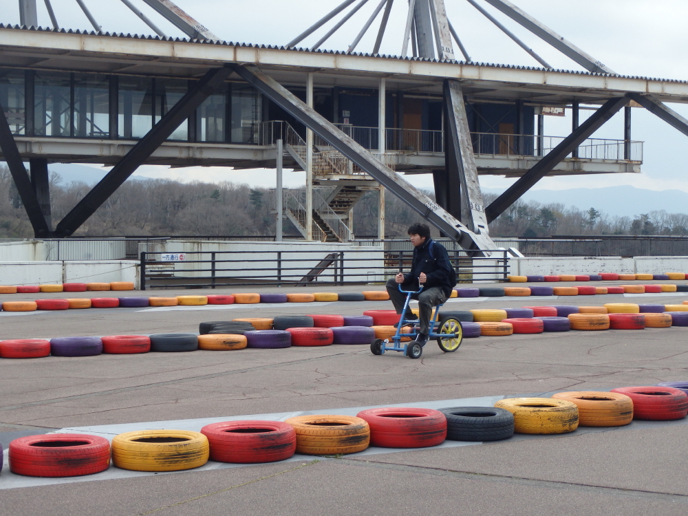 | 二人乗りタンデム自転車でファミリーサーキットを一周する。cycle UFOは輪の中に入ってペタルを踏む。 |