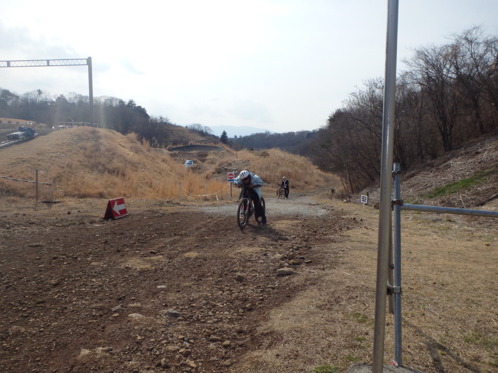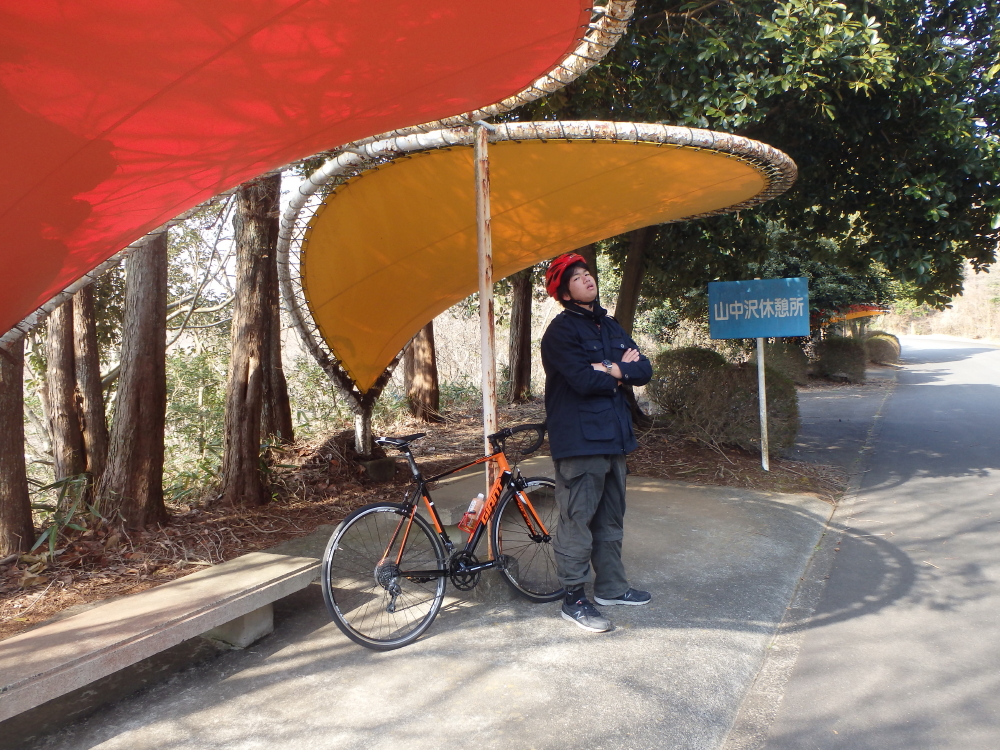 | 途中に中山沢休憩所があり、一息入れる。舗装道路にも繋がっているようで、電動自転車で来ている人もいた。改めて、マウンテンバイクコースの看板を見ると、5kmサーキットコースの内側にあるようだ。サイクルゴーランドに乗ってマウンテンバイクの疲れを癒す。 |