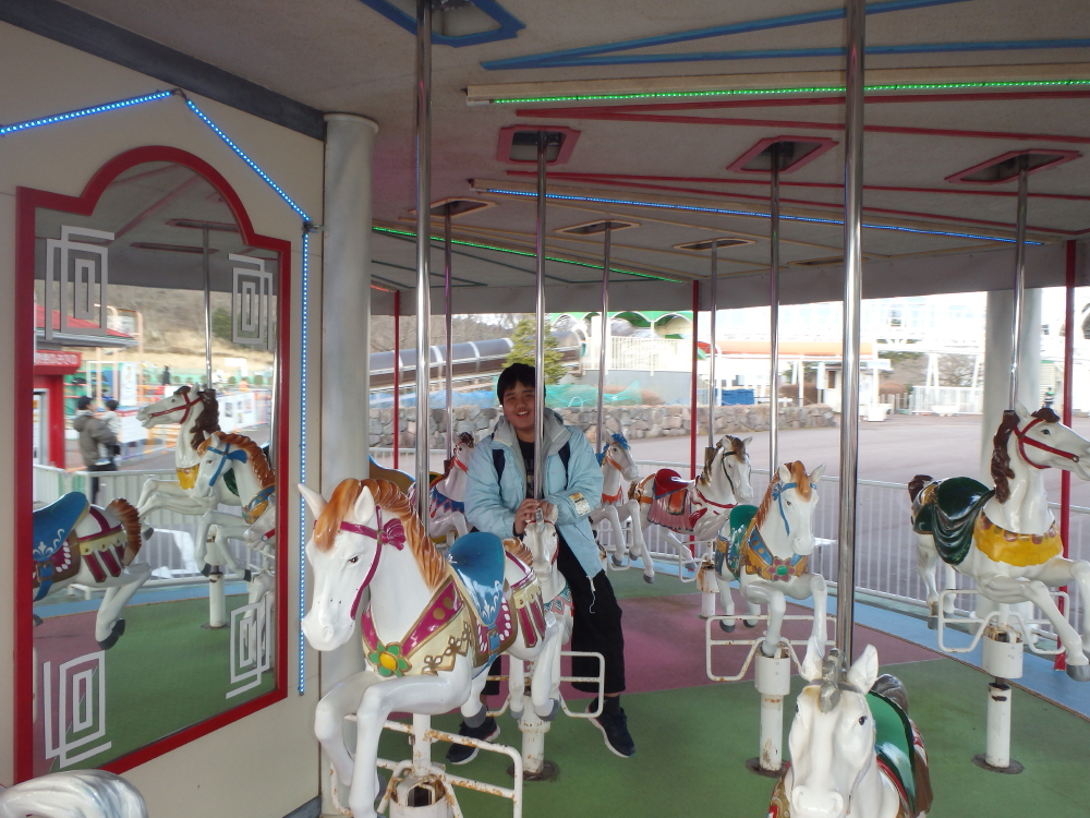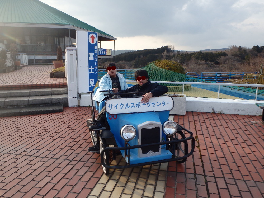 | 最後にファミリーサーキットと水上自転車に乗る。帰り際に展望レストラン富士見の前でレトロな車や12人で漕ぐパーティーバイク(Party Bike)に乗り記念写真を写す。 |