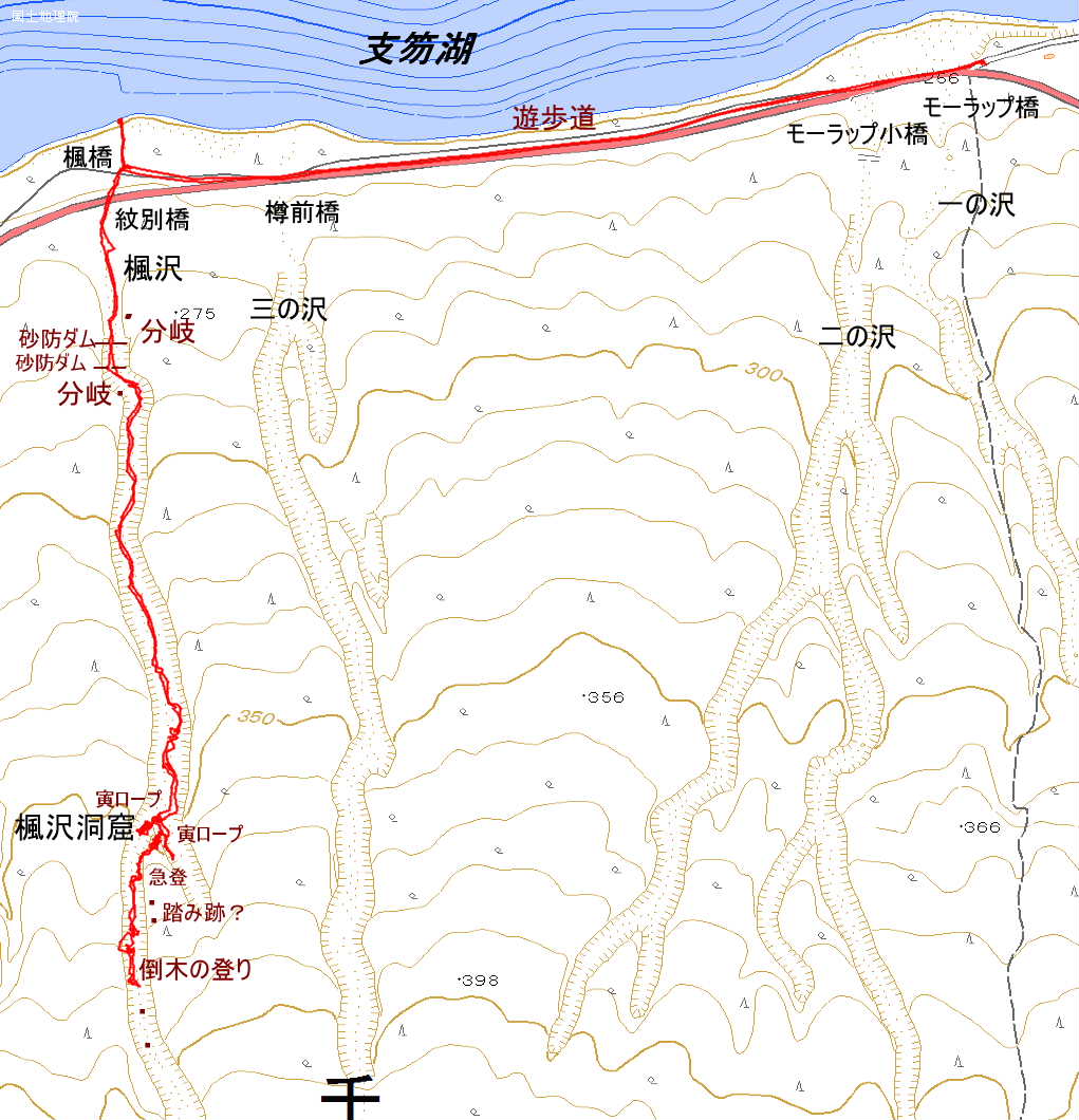 二人の山行記録(遊びの時間含む) 2018(H30)年8月20日(月) 曇り 長靴 往復距離7.333km(自転車3km+徒歩4.333km) 2:54 8:23路駐場所→自転車→8:36楓橋8:39→8:41紋別橋→8:45分岐→8:46砂防ダム→8:48埋もれた砂防ダム・分岐→9:15洞窟9:21→右岸へ→9:29鎖場→9:38倒木のステップ→9:49引き返し→9:51倒木のステップ→10:11東側の沢へ10:16→11:51紋別橋→11:52楓橋→10:53支笏湖畔11:02→11:05楓橋→自転車→11:17路駐場所 |