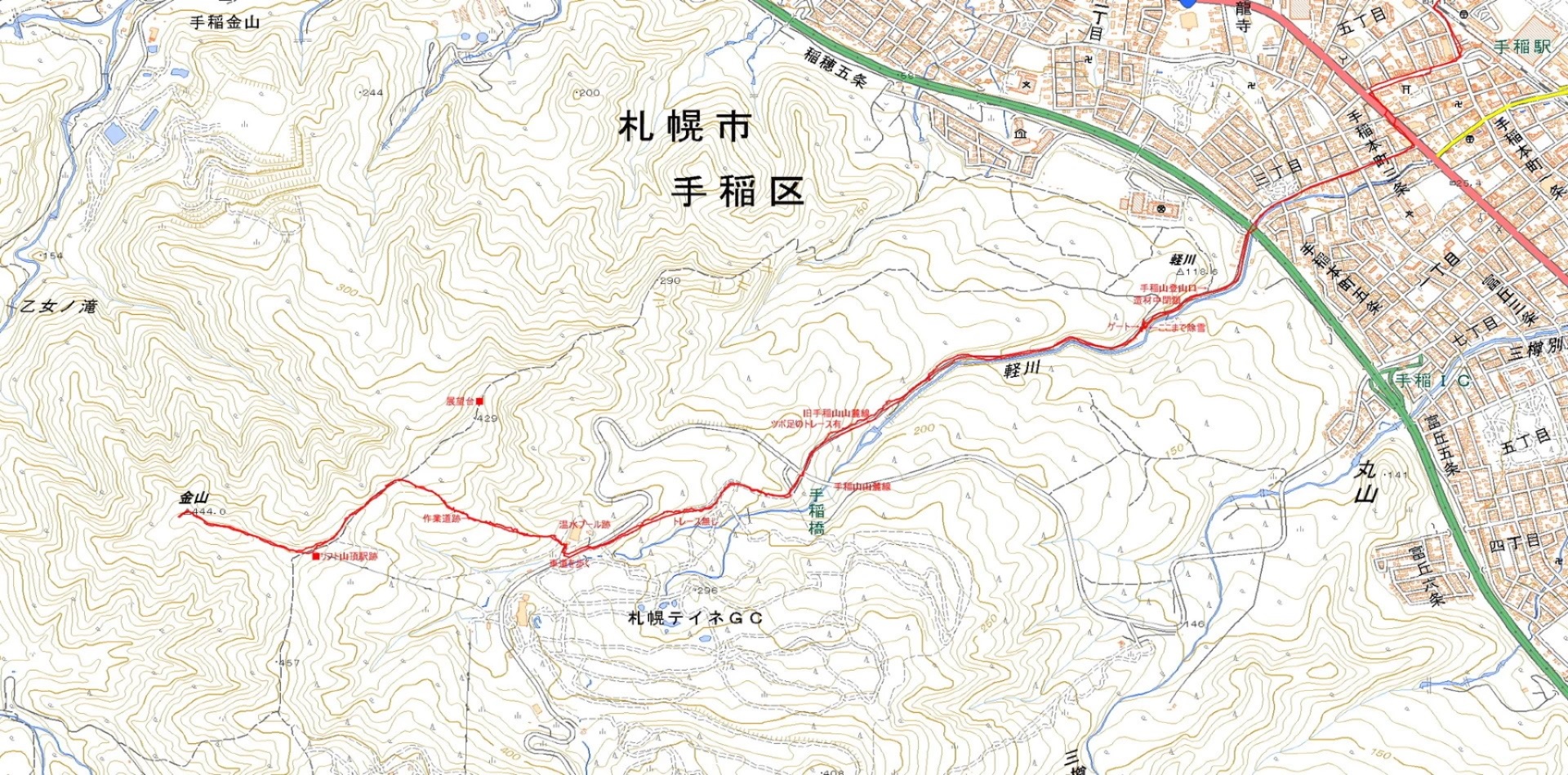 | ルート | 滝の沢 | 乙女の滝 | 手稲鉱山 | 金山PA | 金山の滝 | 温水プール跡 | スキー場 | 旧山麓線 |