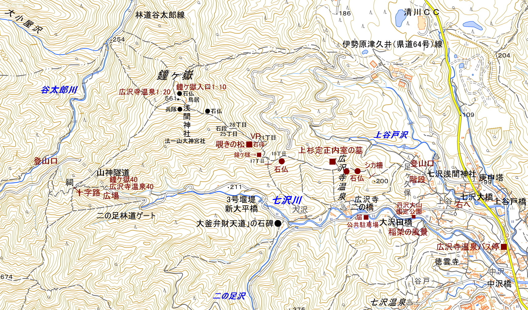 アクセス 伊勢原からバスで広沢(こうたく)寺温泉の停留所で降りる。温泉に向かって行き分かれ道を右に折れると、七沢浅間神社の鳥居がある。 国土地理院地図 Google Map 登山道地図クリック大→| |
